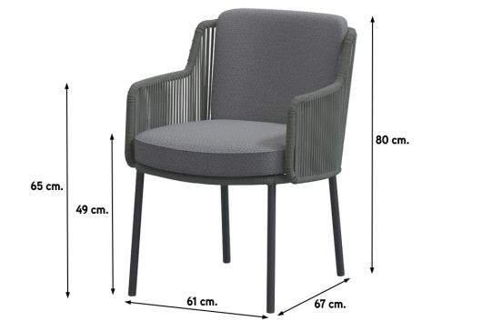 Het frame van de 4 Seasons Bernini tuinstoel is gemaakt van stevig RVS. Dit materiaal heeft een lange levensduur en kan niet verroesten. Voor extra bescherming is het frame afgewerkt met een antracietkleurige coating welke kras- en stootvast is. Om het frame is het rope bevestigd. Rope is gemaakt van allemaal draden die zijn samengevoegd tot een soort touw. De kern van deze draden bestaan uit kunststof waardoor het geen vocht kan opnemen. Daarnaast is het rope materiaal Uv-bestendig en kleurvast. De comfortabele kussens die standaard meegeleverd worden zijn gemaakt van all-weather kwaliteit. Ze kunnen dus gewoon buiten blijven liggen. De kussens zijn voorzien van afritsbare hoezen die gewassen kunnen worden op 30 graden. Ideaal wanneer ze vies geworden zijn.