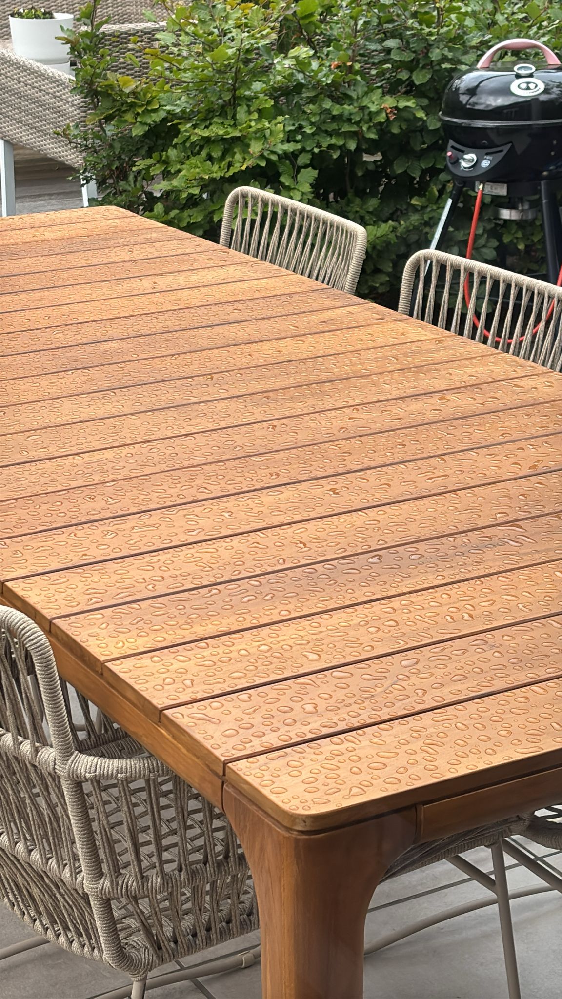 Hout en dan specifiek teakhout. Dat is waar de Liam tuintafel van gemaakt is. Het robuuste hout is makkelijk in onderhoud en geeft een fijne uitstraling aan deze tafel. De tafel heeft als tafelblad losse latten van teakhouten die op de poten zijn gemonteerd. Een knapstaaltje vakwerk van Taste! Wat goed is om te weten is dat teakhout een natuurlijk proces zal doorgaan door weersinvloeden. Dit zal het hout laten vergrijzen en mogelijk wat scheurtjes geven. Wanneer je liever de huidige warme kleur van het hout wilt behouden, kan je het hout behandelen met een teak protector. Een teakhouten tafel hoef je niet af te dekken met een beschermhoes, wanneer je dat doet kunnen er namelijk lelijke vlekken ontstaan in het hout.
