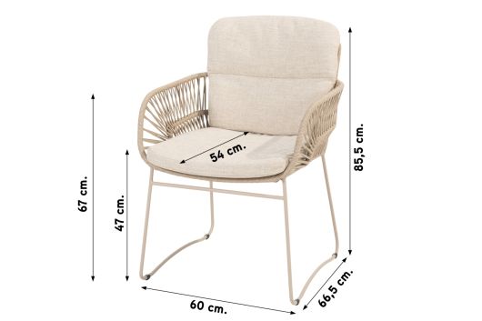 De 4 Seasons Murcia tuinstoel heeft een solide frame van Roestvast Staal (RVS) en is voorzien van een matte coating voor extra bescherming tegen krassen en stoten. Hierdoor kan de stoel vrijwel zonder enig onderhoud de weersinvloeden trotseren. Het zitgedeelte van de Murcia tuinstoel is vervaardigd uit Rope. Dit materiaal heeft een minimalitische uitstraling en voelt zacht aan, toch is het bepaald geen touw. Rope is namelijk opgebouwd uit een polypropyleen basis met een kunststof kern. Het omhulsel wordt gemaakt van een acryl stof en is zeer waterafstotend, Uv-bestendig en kleurvast. Perfect materiaal om te verwerken in een tuinstoel. Er wordt dan ook maar liefst 5 jaar garantie gegeven op dit materiaal. Met de kussens van de 4 Seasons Murcia dining tuinstoel ben je verzekerd van optimaal zitcomfort. De waterafstotende kussens zijn voorzien van een afneembare hoes welke gewassen kan worden op 30 graden. Mocht je de hoes willen wassen dan adviseren wij om dit te doen zonder wasmiddel.