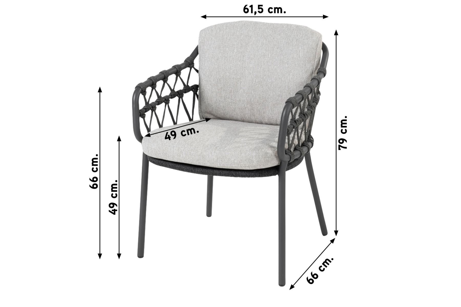 Het frame van de Calpi tuinstoel is gemaakt van RVS. RVS wordt vaak gebruikt omdat het een lange levensduur heeft en onderhoudsvrij is. Je wilt natuurlijk onbezorgd en lang kunnen genieten van jouw nieuwe tuinmeubel! Om het RVS frame zit touw geknoopt. Het touw zorgt voor een unieke uitstraling en is helemaal volgens de laatste tuintrends. Het unieke patroon geeft een exclusieve look aan deze Calpi stoel! De kussens in het licht grijs steken mooi af bij het donkere antraciet. De kussens zijn lekker zacht, waardoor je er lekker in wegzakt. Toch heb je een actieve zit. Dit komt door de rechte rug. De meegeleverde kussens zijn weersbestendig, geen zorgen dus wanneer er regen voorspeld wordt! We raden wel aan om de kussens op te bergen in bijvoorbeeld een opbergbox of schuur wanneer deze langere tijd niet worden gebruikt.