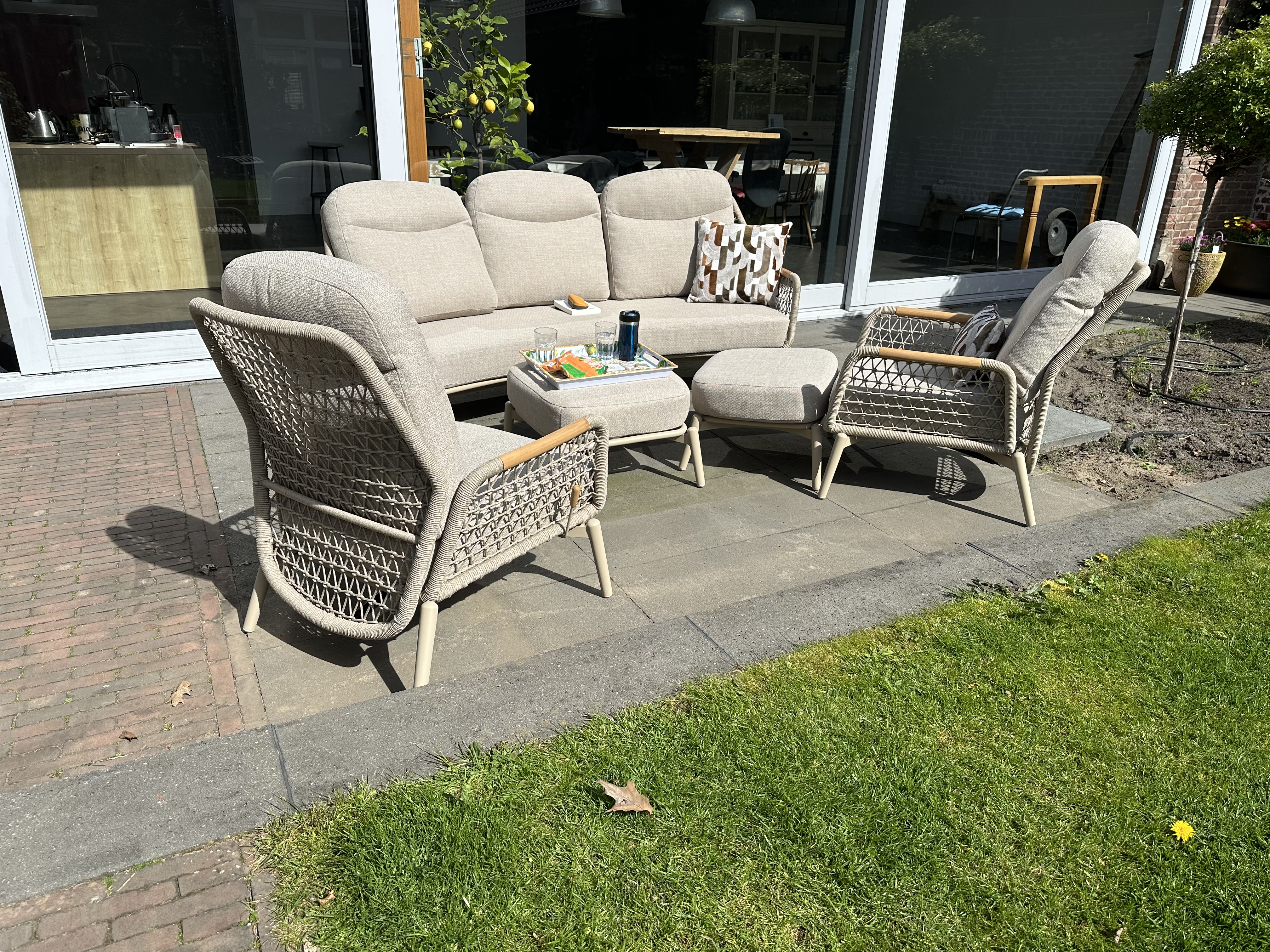 Wat deze set extra bijzonder maakt, is de toevoeging van de Welton up&down tuintafel in Latte. Dankzij het traploos verstelbare onderstel bepaal je zelf de hoogte: van lage loungetafel tot volwaardige diningtafel. Het keramieken blad in een zachte betonlook is krasbestendig, onderhoudsvriendelijk én stijlvol. Zo geniet je van de perfecte balans tussen ontspannen loungen en praktisch tafelen, zonder concessies te doen aan uitstraling.