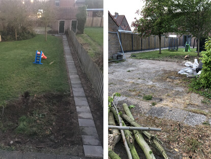 Voordat er begonnen kon worden met het aanleggen van de tuin werd eerst alles gestript. Zo kan de tuin vanaf de basis weer worden opgebouwd tot een mooie en strakke tuin. Het enige wat blijft staan is de schutting en een paar bomen.