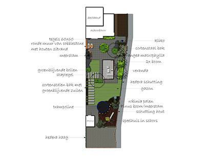In dit geval is er gekozen voor een strak en modern ontwerp, met zitruimte zowel in de zon als schaduw, een hoop groen én een speelruimte waar de kinderen hun energie kwijt kunnen.