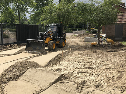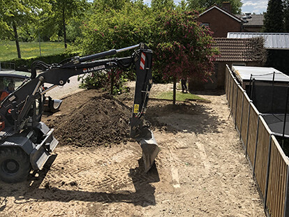 Wanneer alles gestript is, is het tijd voor de aanleg van de nieuwe tuin. Het is tijd om de tuin iets op te hogen met zand, zodat de grasmat er straks mooi bij ligt. Er dient een juiste bodem gelegd te worden op de plekken waar straks beplanting gaat komen. Op de foto is ook te zien hoe een nieuw deel van de schutting is geplaatst.