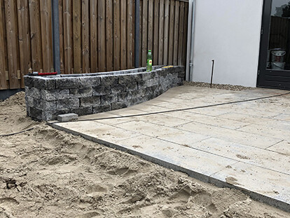 Zodra de grond glad gemaakt is en overal gelijk is, is het tijd om te beginnen met betegelen. In de tuin van Dave wordt er slim gebruik gemaakt van de ruimte. Iets wat op eerste gezicht een plantenbak lijkt te worden is geen plantenbak. Later wordt deze rand bekleed, waardoor er een extra zitplek wordt gecreëerd. Met een paar leuke tuinkussen heb je deze zitrand zo omgetoverd naar een leuke zitplek. De zitrand is gemaakt van stapelblokken die op elkaar gelijmd zijn. Door de zitrand in een flauwe ronding te laten lopen geeft deze een speelse uitstraling aan het terras.