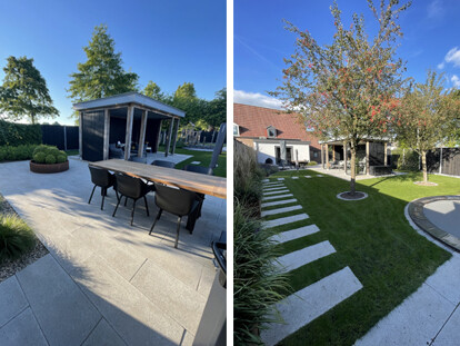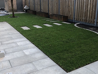 Zodra alle Schellevis tegels erin liggen en de grond voorzien is van een goede bodem is het tijd voor kleur in de tuin. De grasmatten, bomen en planten kunnen de grond in. Daarnaast is het ook tijd om de plantenbakken te gaan plaatsen. Zodra de grasmat erin ligt, wordt de tuin al steeds meer een mooi geheel.