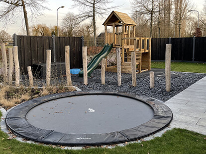 De kinderen van Dave krijgen een kinderspeelparadijs in eigen achtertuin. Hier kunnen de kinderen straks al hun energie kwijt en zich uren vermaken met spelen. Er wordt gebruik gemaakt van een natuurlijke scheiding tussen het speeltoestel en de trampoline door middel van boomstronken. Dit geeft een natuurlijk effect aan de tuin.