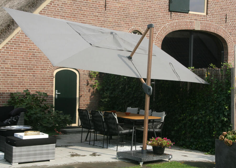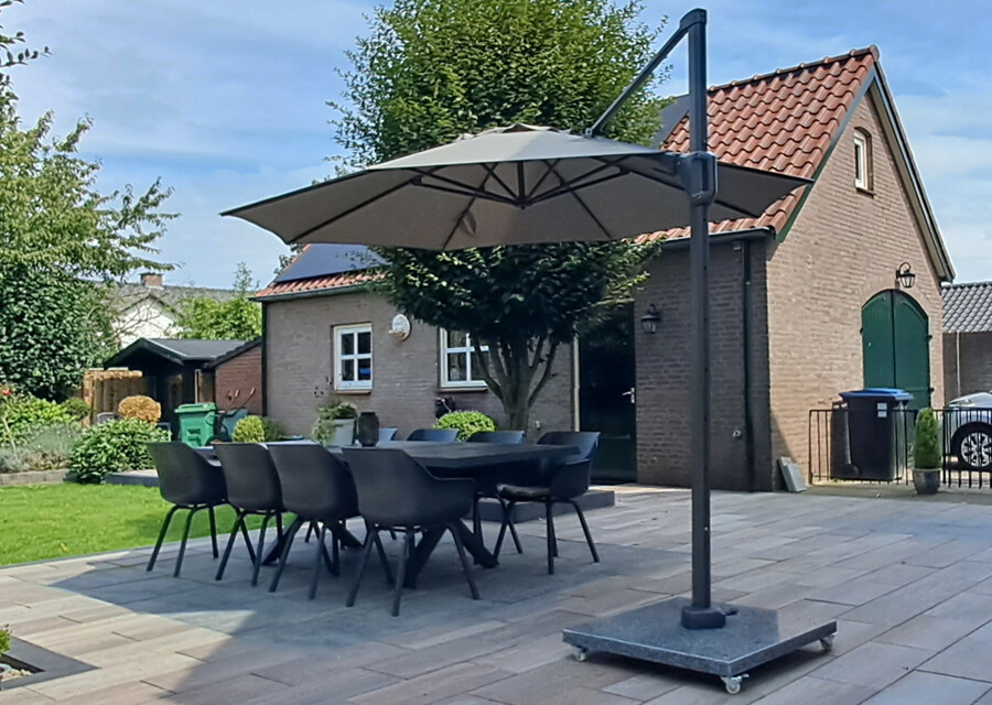 Ga voor een stevige parasolvoet van het juiste gewicht. Hoe groter de zweefparasol, hoe zwaarder de parasolvoet.