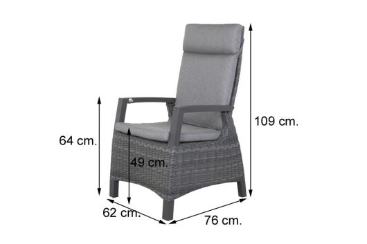 De Darwin tuinstoel heeft een aluminium frame. Om dit frame is het kunststof wicker gevlochten. Het wicker is antraciet van kleur en geeft de stoel een luxe en eigentijdse uitstraling. Het wicker is een mix van verschillende maten wicker. Dit geeft het vlechtwerk een speelse uitstraling. De open armleuningen zorgen voor een ruimtelijk uitstraling. Ook is dit gemakkelijk bij het verplaatsen van de stoel. Je kan de leuning namelijk goed vast pakken. De rugleuning van de wicker verstelbare tuinstoel verstel je eenvoudig door het knopje in te drukken die aan de binnenkant van de armleuning is gemaakt. Dit verstellen gaat traploos zodat je de leuning op iedere gewenste stand kan stopzetten. Dit maakt dan ook dat de wicker verstelbare tuinstoel voor iedereen lekker zit.