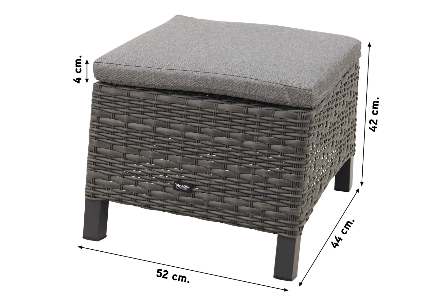 De voetenbank heeft een aluminium gepoedercoated frame. Aluminium heeft als voordeel dat het licht in gewicht is, niet kan verroesten en super sterk is. Om dit frame is het wicker gevlochten. Het wicker is uitgevoerd in de kleur antraciet. Dit combineert mooi bij het antraciet frame van de wicker verstelbare tuinstoel. Het kussen is uitgevoerd in een grijze kleur en voorzien van een afritsbare hoes. Mocht het kussen vies zijn geworden dan kun je deze uitwassen. Het kussen is niet waterbestendig. Bij geen gebruik adviseren wij dan ook om het kussen op een droge en geventileerde plek op te bergen.