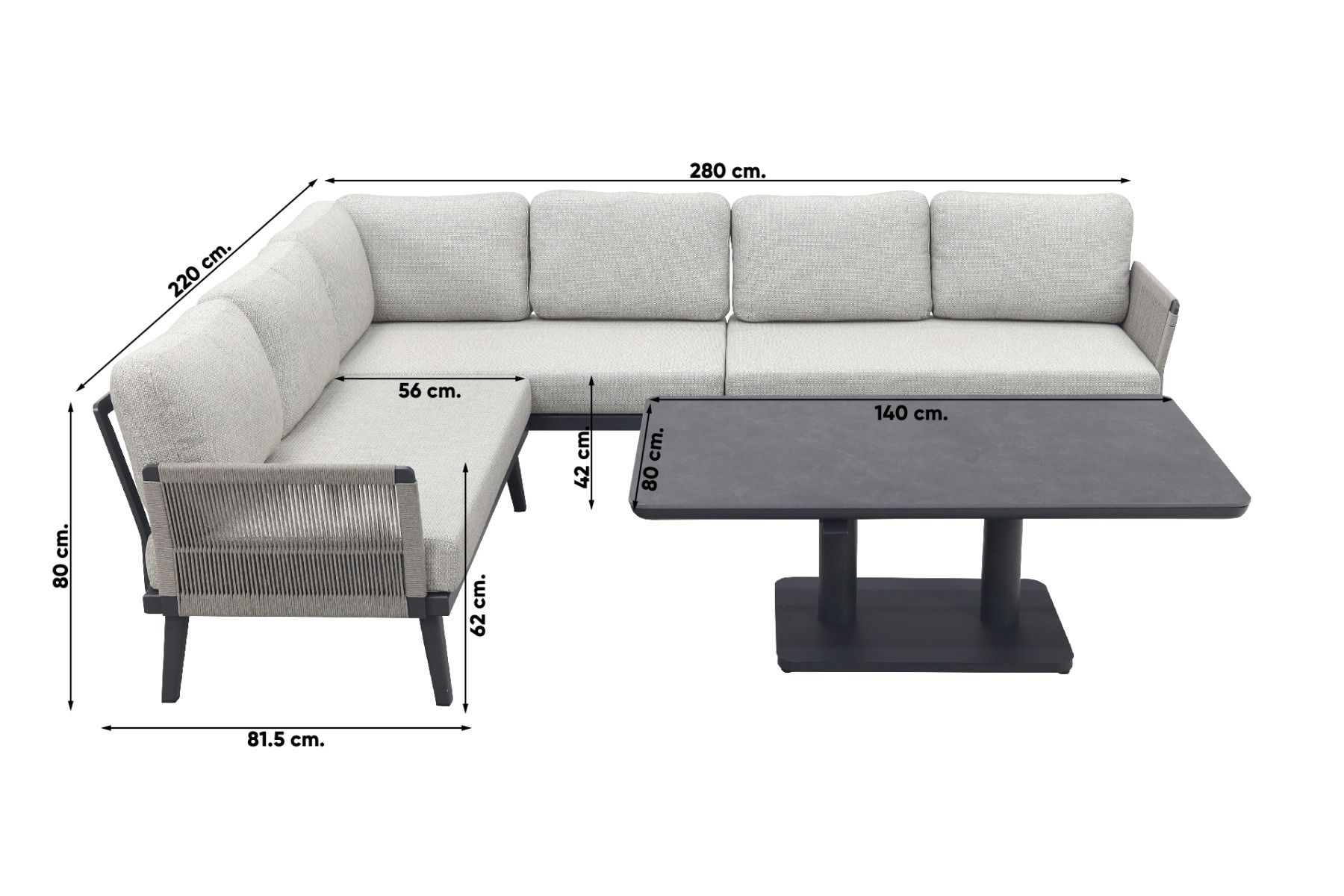 Geniet van ultieme ontspanning met de onze Durban loungeserie. Het frame is gemaakt van aluminium in antracietkleur. Aluminium wordt veel gebruikt in tuinmeubelen door zijn positieve eigenschappen. Zo is aluminium licht van gewicht, roestbestendig en gaat het lang mee. Zo is het niet alleen een prachtige keuze, ook een duurzame. De armleuningen zijn voorzien van een rope motief. Dit geeft een moderne uitstraling aan deze loungemeubels. Deze serie bestaat onder andere uit loungestoelen, loungebank en een hoekbank. Door de licht grijze kussens ben je voorzien van een heerlijk zitcomfort waardoor je graag gaat zitten.