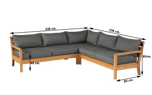 De kussens van teak houten loungeset St. Peter zijn grijs van kleur. Dit staat mooi in contrast met de kleur van het teak hout. De kussens hebben een stevige vulling zodat de St Peter loungeset erg lekker zit. Om deze vulling is een olefin kussenhoes gemaakt. Dit is een sterke stofsoort die verkleuring tegen gaat. De kussenhoezen zijn voorzien van een ritssluiting, zodat het ook nog eens mogelijk is om deze uit te wassen.