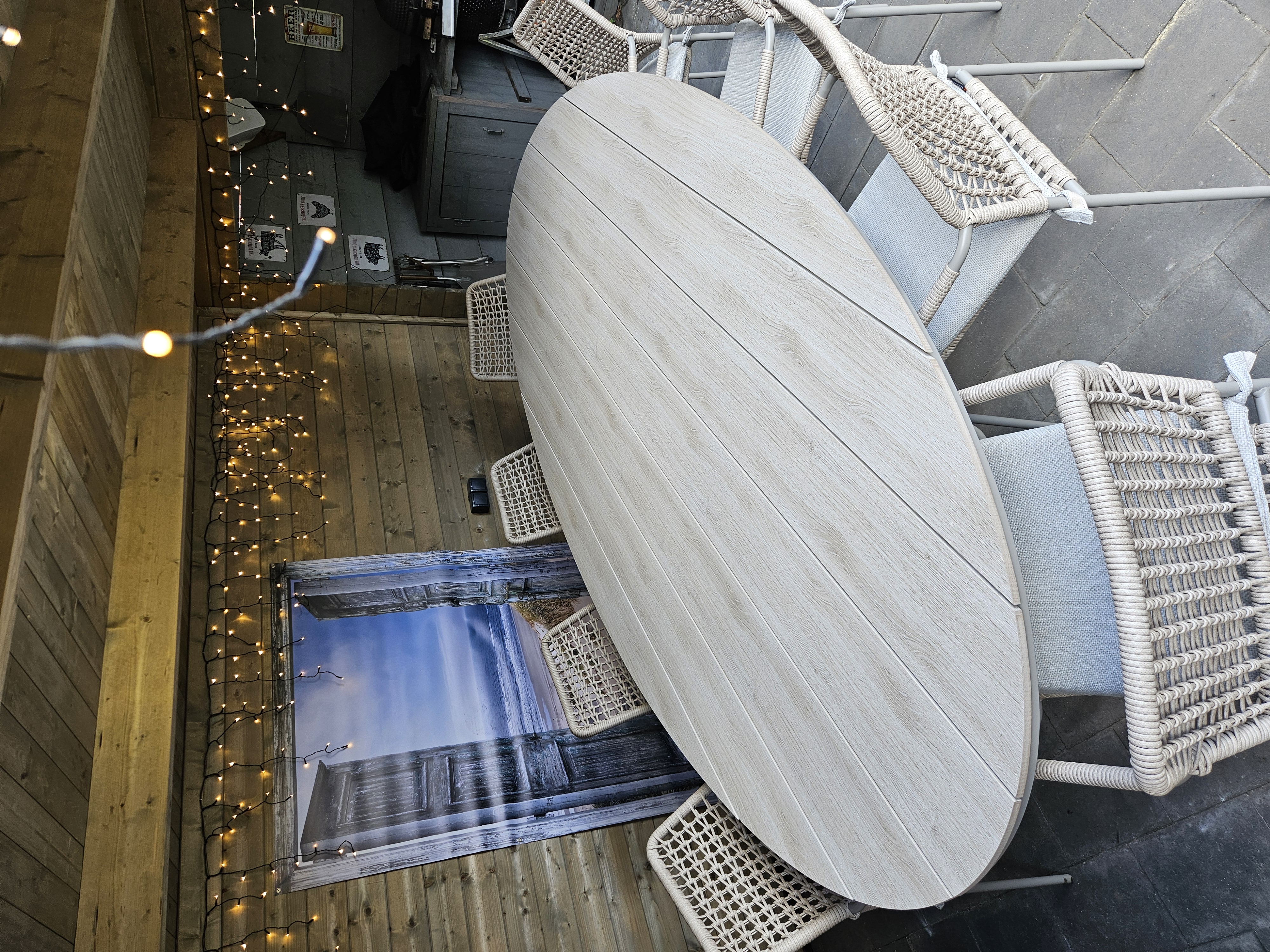 Mooi houtlook design tafel. Met stalen kruisframe. Montage was makkelijk. Goed schoon te maken. Staat perfect onder mijn overkapping! Al een heerlijke paasbrunch aan de eettafel genuttigd.