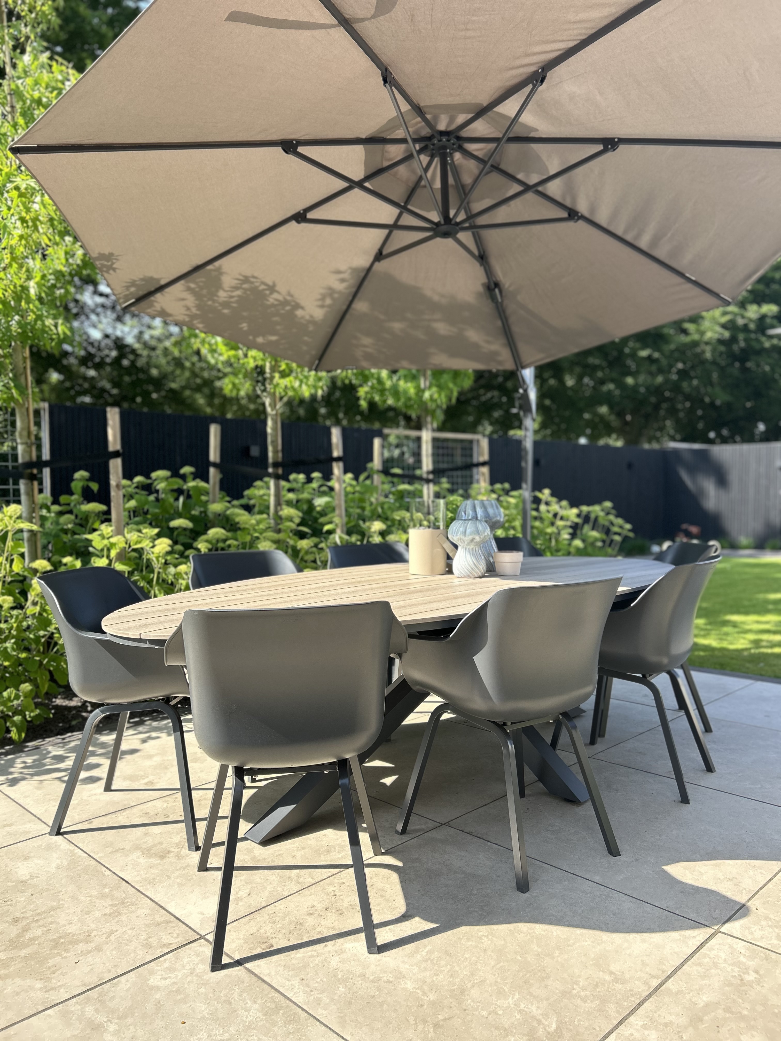 De Edison tuintafel is een ruime tafel met een unieke uitstraling. Met zijn lengte van 280 cm. is de Edison een echte 8 persoons tuintafel ovaal. Geniet samen met vrienden of familie van een heerlijk diner of gezellige barbecue. De Edison tuintafel heeft een schitterend design in de vorm van een kruisonderstel met een ovaal tafelblad in houtlook. De ovale tuintafel kan gecombineerd worden met allerlei materialen tuinstoelen.