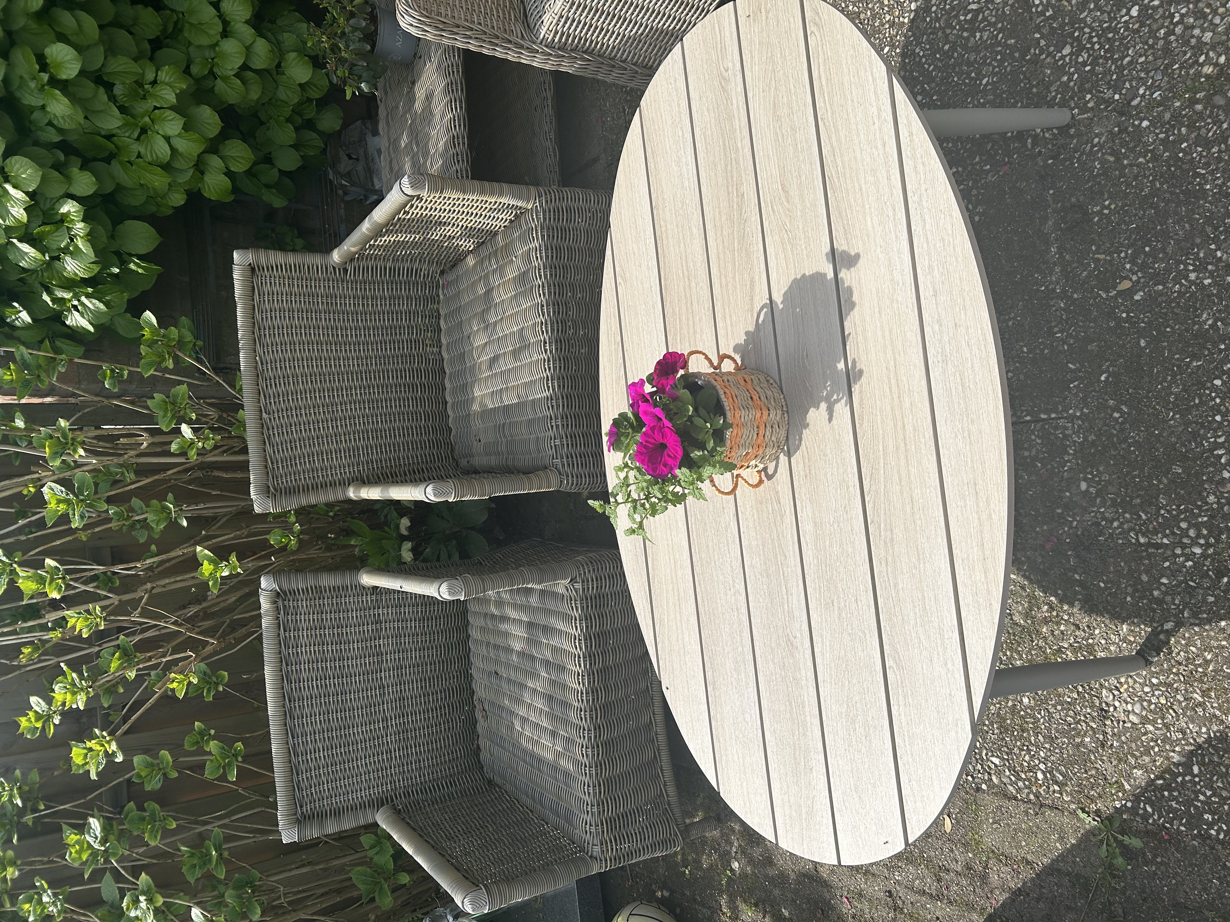 Deze tafel is wat hoger dan gebruikelijk bij loungetafels en past heel mooi bij wicker stoelen. Heel mooie kleur, licht van gewicht en niet duur. De ovale vorm is heel handig.