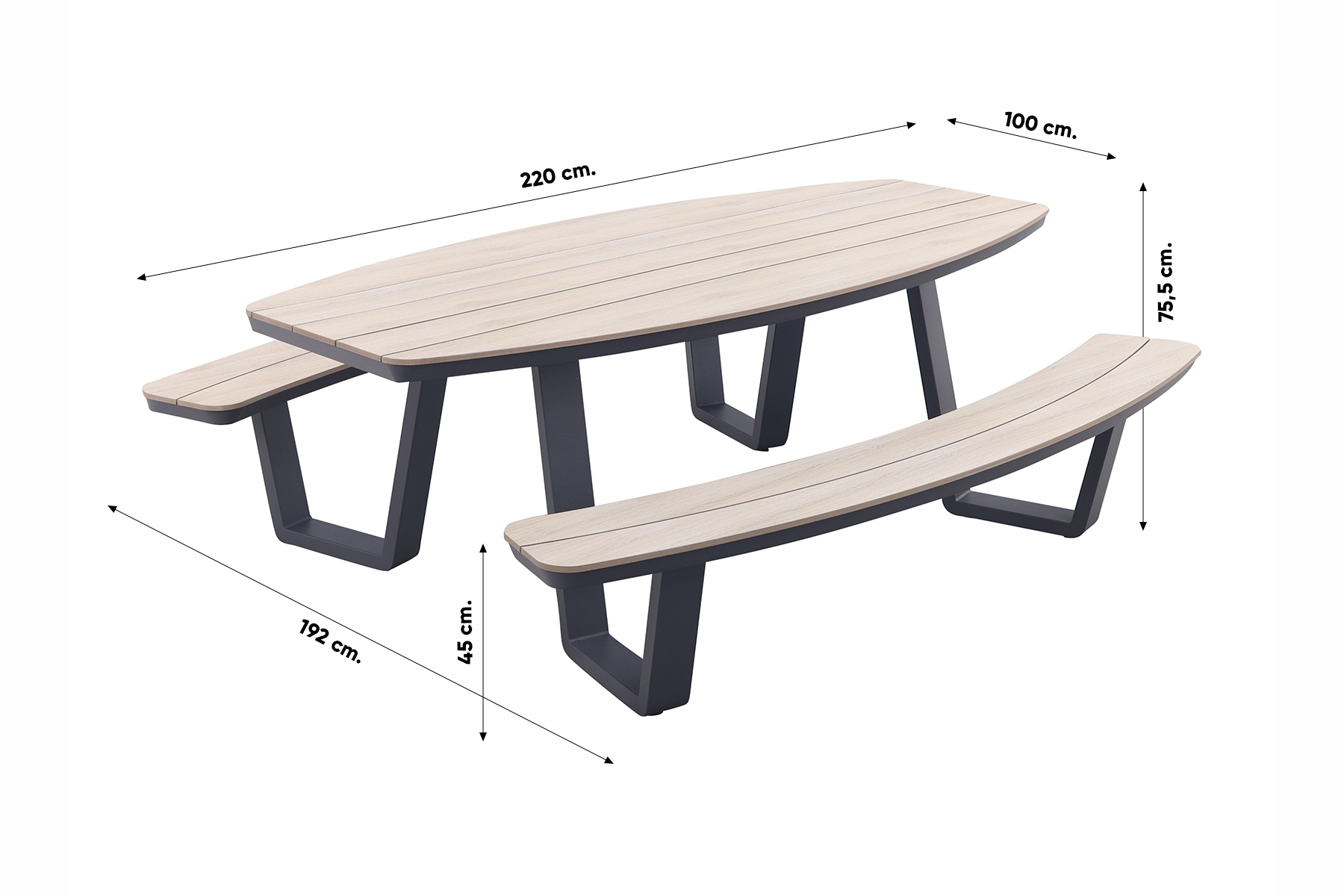 Tafel: 100 cm. (Totaal: 193 cm.)