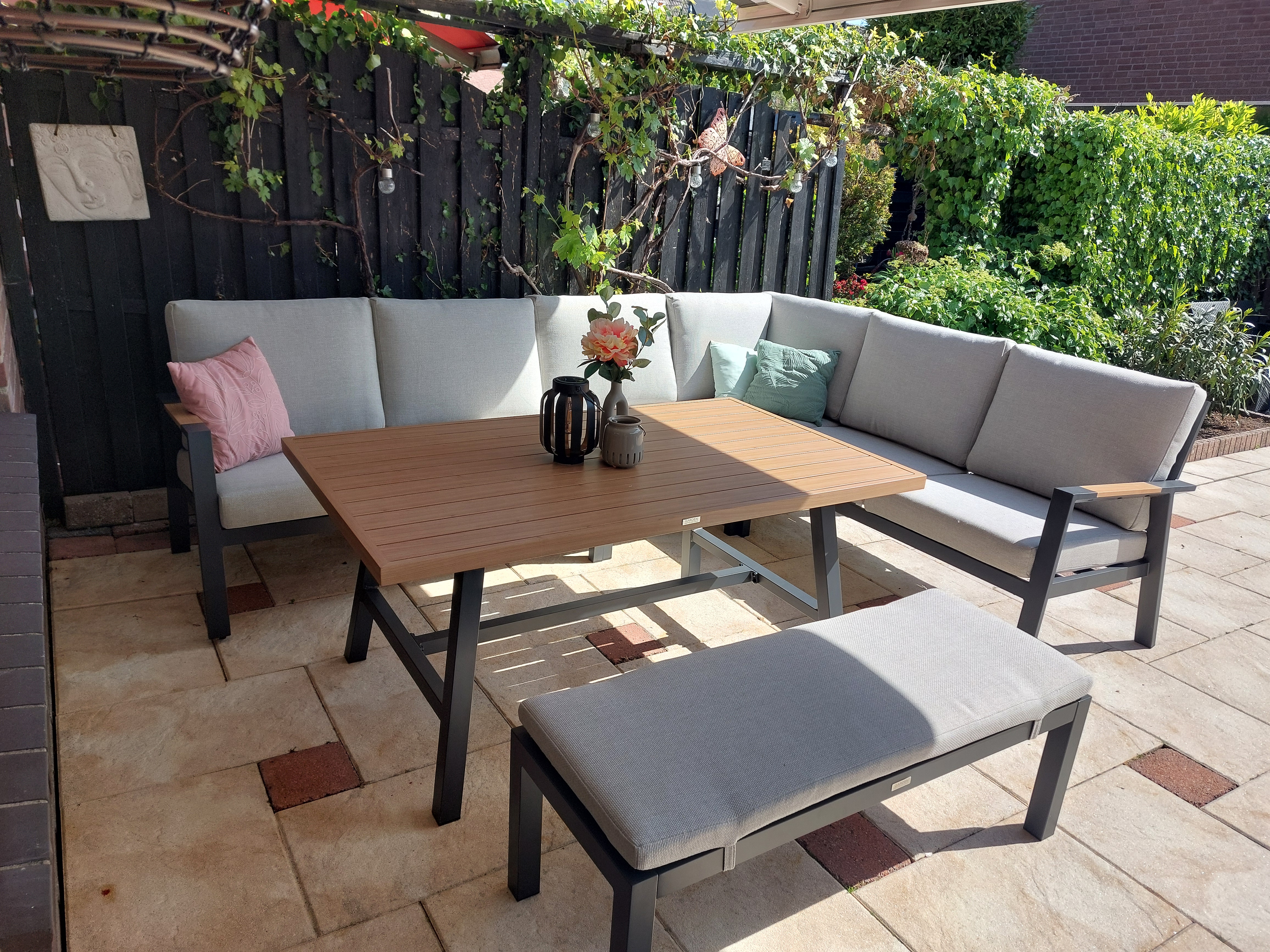 De GI Elati lounge-dining hoekset is perfect voor wie graag ontspanning en dineren samenbrengt. Dankzij de verhoogde tafel kun je er niet alleen heerlijk loungen op de bank, maar ook comfortabel eten. De zachte, meegeleverde kussens zorgen voor extra zitgemak, terwijl de aluminium details in warme teakhout-look een stijlvolle uitstraling geven aan je tuin of terras. Deze set past prachtig in zowel moderne als industriƫle tuinen en creƫert een open en ruimtelijk effect dankzij het luchtige ontwerp van de armleuningen. Bestel de GI Elati eenvoudig online en maak van je buitenruimte een echte blikvanger. Wil je de set liever eerst bekijken? Bezoek een van onze showrooms in Opheusden, Duiven of Apeldoorn.