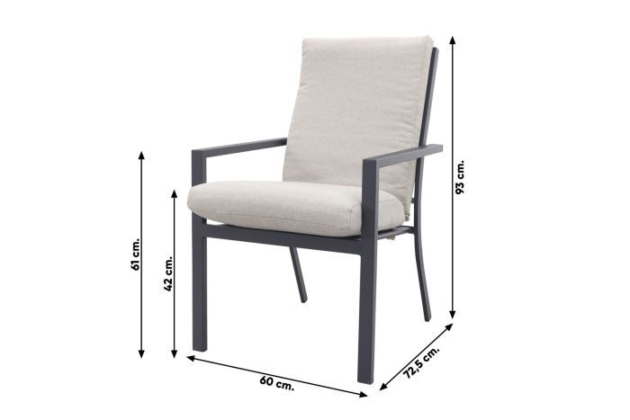 De Sergio tuinstoel is vervaardigd uit hoogwaardig aluminium, wat het niet alleen lichtgewicht maakt, maar ook roestvrij en eenvoudig te onderhouden. Dit maakt aluminium een veelgebruikt materiaal voor tuinmeubelen. Eventuele vlekken van opspattend water zijn gemakkelijk te verwijderen met een mild sopje en een zachte doek. Standaard worden de stoelen geleverd met zandkleurige kussens, die echt het verschil maken! De royale kussens zijn gemaakt van hoogwaardig polyester en voorzien van een waterafstotende coating, waardoor gemorste drankjes eenvoudig weggeveegd kunnen worden. Hoewel de kussens waterafstotend zijn, zijn ze niet volledig waterdicht.De outdoor diningstoel valt op door zijn stoere zwarte frame en prachtige zandkleurige kussens, die een vleugje 'Dessert' toevoegen aan je buitenruimte.
