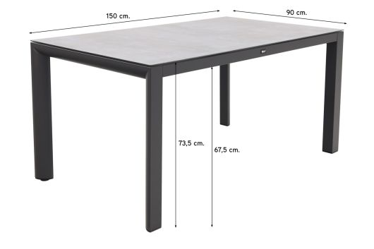 De Baltimor tuintafel biedt met zijn lengte van 150 cm. plaats aan 4 personen. Je kan eventueel met 6 personen dineren door gebruik te maken van de kopse kanten van de tafel. Het frame van de Baltimor tuintafel is vervaardigd uit aluminium en behandeld met een beschermende coating. Deze coating zorgt ervoor dat het frame kras- en stootvast is. Voordeel van aluminium is dat het weinig onderhoud nodig heeft, licht in gewicht is en niet kan verroesten. Het tafelblad van de Baltimor tuintafel is gemaakt van "ceramic on glass". Dit is een keramiek laagje dat op een geharde glasplaat wordt aangebracht. Beide materialen zijn bestand tegen diverse weersinvloeden en perfect geschikt voor gebruik buitenshuis. Wanneer het tafelblad vies is geworden kun je deze het beste schoonmaken met water en een zachte doek. Voor een grote schoonmaakbeurt kun je een neutraal reinigingsmiddel toevoegen. Gebruik voor het schoonmaken nooit schuurmiddelen zoals een schuursponsje. Dit kan namelijk vegen en vlekken veroorzaken die er niet meer uit gaan. Gebruik nooit een hogedrukreiniger. Door de hoge waterdruk kan het materiaal aangetast worden.