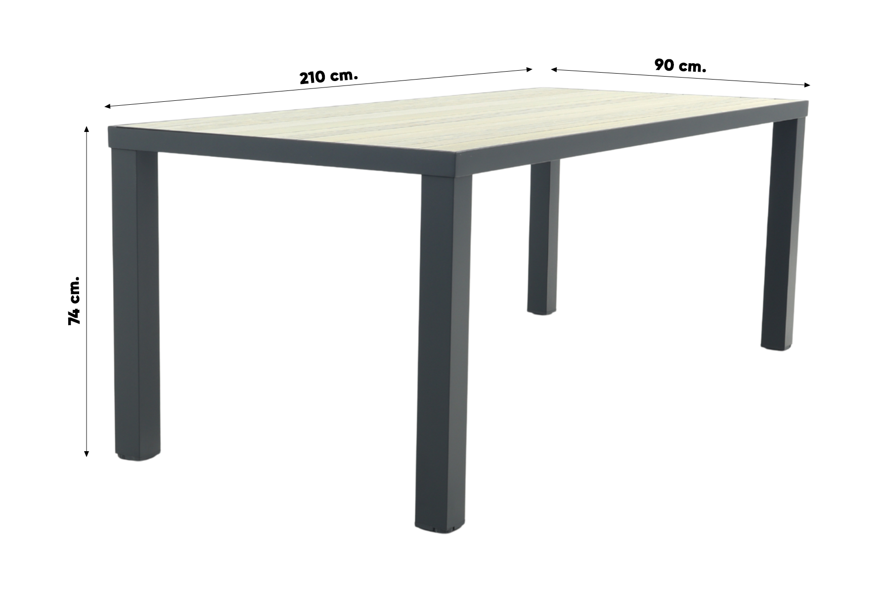 De Nola tuintafel is gemaakt van aluminium, een materiaal dat bekendstaat om zijn stevigheid en weerbestendigheid. Het tafelblad heeft een realistische houtlook die zorgt voor een warme en natuurlijke sfeer in je tuin, zonder het onderhoud dat echt hout vereist. Regen, zon of wind? Geen probleem, deze tafel blijft er mooi uitzien. De royale afmeting van 210x90 cm biedt voldoende ruimte voor gezellige diners of borrels. En goed om te weten: de Nola is ook verkrijgbaar in twee andere formaten (90x90 en 160x90 cm.), zo kies je altijd de maat die past bij jouw tuin.