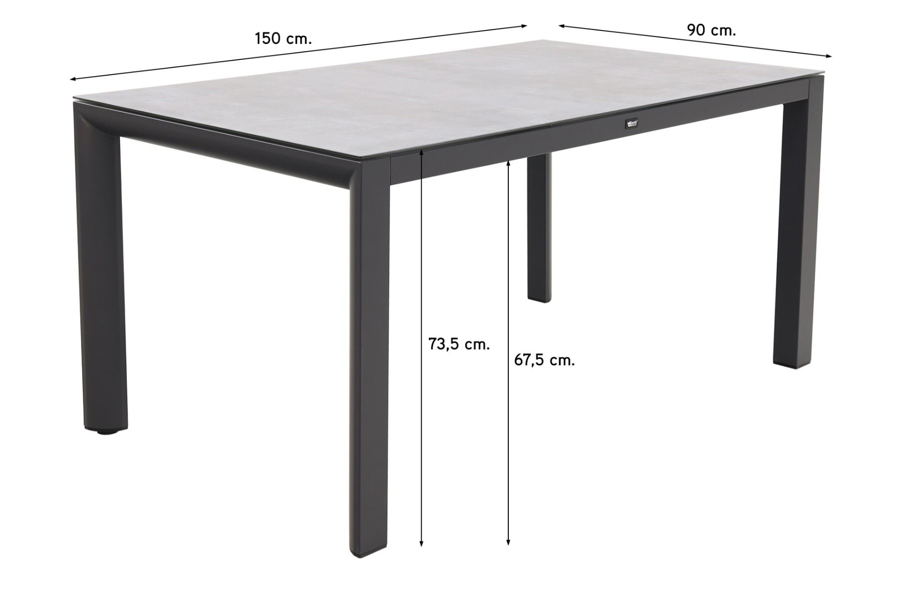 De Baltimor tuintafel heeft een aluminium frame met antracietkleurige poedercoating, wat zorgt voor een krasvaste, weerbestendige afwerking. Het grijze (betonlook) tafelblad is gemaakt van keramiek op glas: stevig, stijlvol én makkelijk schoon te maken. De Salvatore tuinstoelen hebben een aluminium frame en een zitting van ademend textileen. De rugleuning is verstelbaar in meerdere standen, en dankzij de ergonomische vorm zit je altijd goed. Zowel het frame als de bekleding is onderhoudsarm, zodat je vooral kunt genieten van het buitenleven.