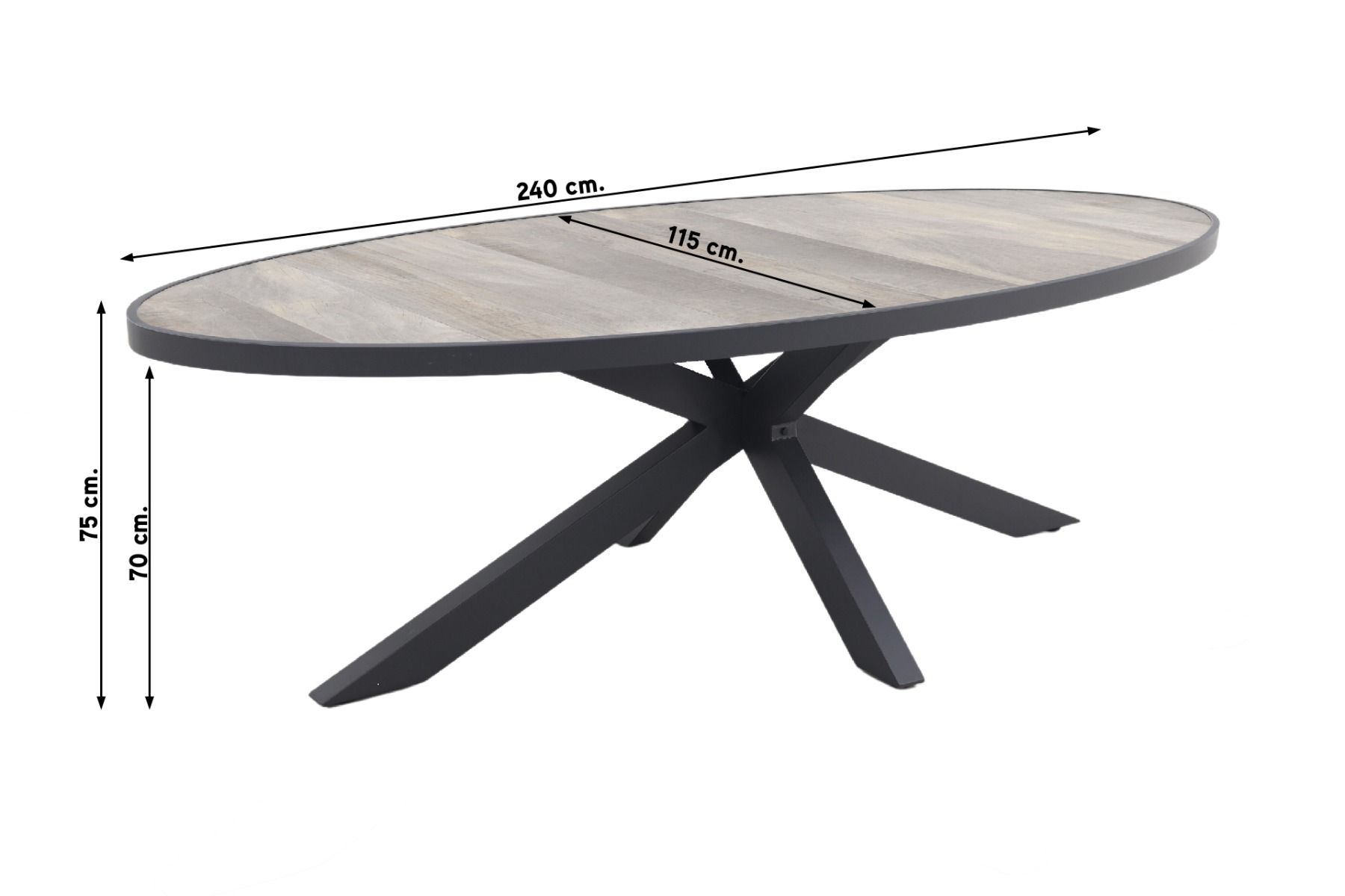 Het ovale blad van de Silva tuintafel heeft een houtlook en is gemaakt van keramiek. Dit biedt niet alleen een stijlvolle uitstraling, maar ook een zeer duurzaam oppervlak dat bestand is tegen krassen, hitte en vorst, zodat de tafel het hele jaar door buiten kan blijven staan. Het aluminium onderstel van de tafel is stevig en onderhoudsarm, zodat je er jarenlang plezier van hebt. De kruisvormige poten van de tafel geven deze een industriële uitstraling, wat perfect past bij een moderne en stijlvolle tuininrichting. Met een afmeting van 240 x 115 cm biedt de tafel genoeg ruimte voor 6 personen om comfortabel te kunnen zitten en te genieten van lange avonden buiten.