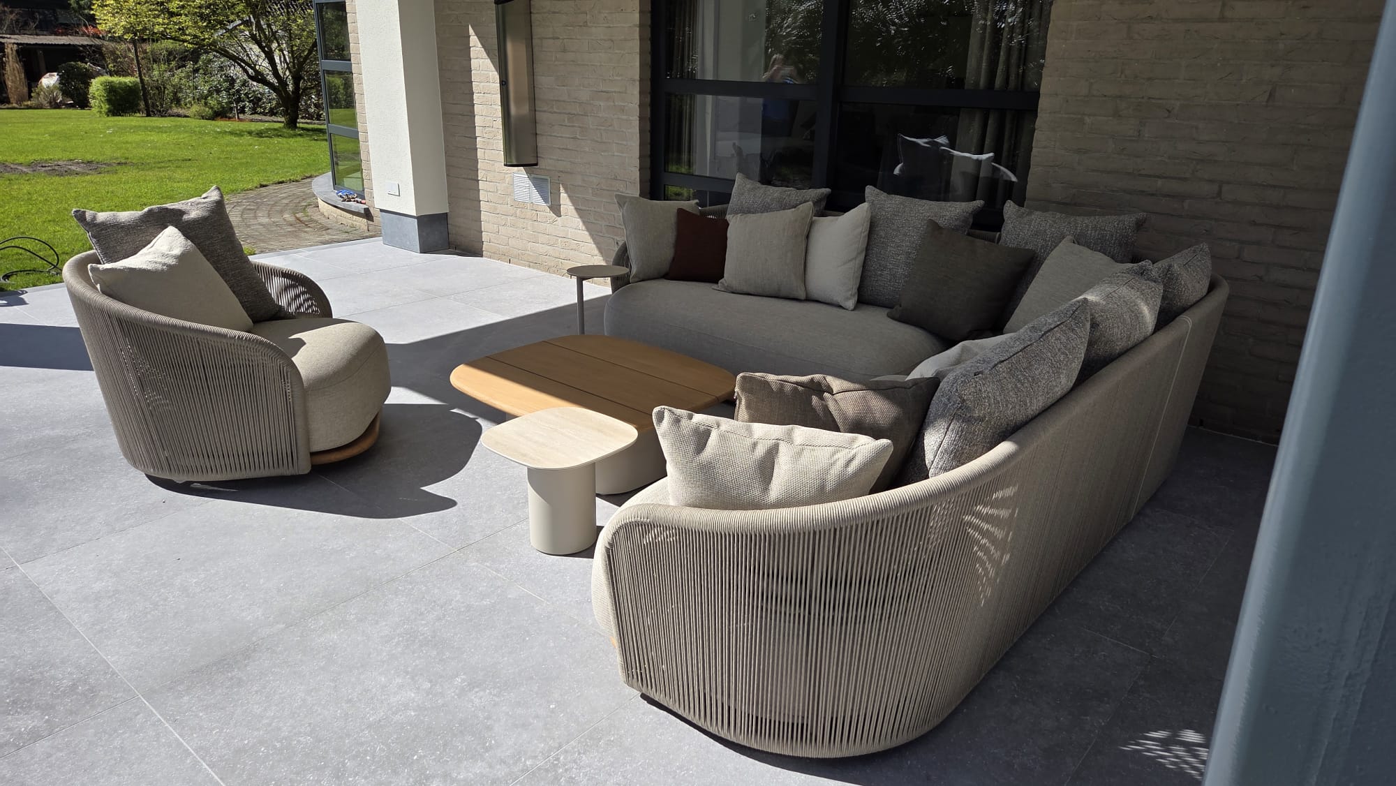 De combinatie van strak gespannen rope vlechtwerk, zachte kussens en warme teakdetails geeft de set een luxe en moderne uitstraling. Dankzij de ronde vormen en de vele rug- en sierkussens zit je altijd heerlijk, of je nu een boek leest of samen geniet van een drankje op het terras. De lichte mokkatinten zorgen voor een rustige sfeer die perfect past in een moderne of natuurlijke tuin. Shop eenvoudig online of ervaar het zitcomfort in een van onze showrooms!