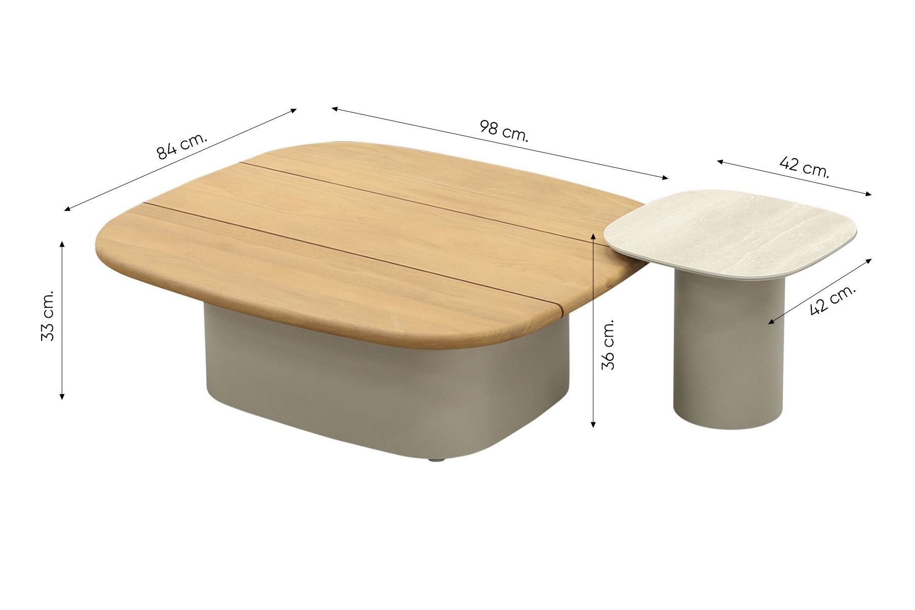 De bekleding van de bank, stoel en kussens is gemaakt van Olefin buitenstof. Dit is een sterke en kleurvaste stof die goed bestand is tegen zon, vocht en vuil. Daarnaast droogt Olefin snel en voelt het prettig aan, waardoor het ideaal is voor tuinmeubelen. De set wordt geleverd met 18 rug- en sierkussens voor extra comfort. De grote koffietafel heeft een teakhouten blad, het teakhout zorgt voor een warme en natuurlijke uitstraling. Door zon en regen kan het hout na verloop van tijd wat vergrijzen. Met een teak protector behoud je langer de originele kleur. De kleinere koffietafel en bijzettafel zijn voorzien van een keramiek blad. Keramiek is krasvast, onderhoudsvriendelijk en goed bestand tegen verschillende weersomstandigheden.