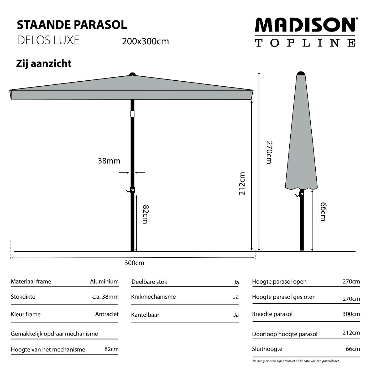 Op zoek naar een moderne en functionele stokparasol? De Madison Delos Luxe met een afmeting van 200x300 cm, is een uitstekende keuze voor wie op zoek is naar een ruime en stijlvolle schaduwplek. Met zijn rechthoekige vorm biedt deze parasol optimale bescherming tegen de zon op je terras of in de tuin.