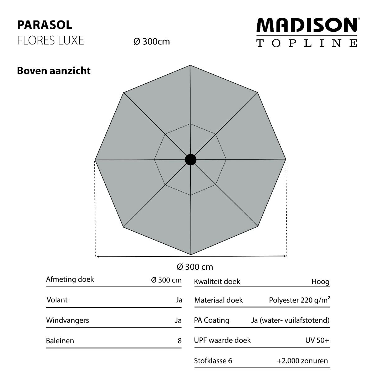 Op zoek naar een moderne en functionele stokparasol? De Madison Flores Luxe met een doorsnede van 300 cm, is een uitstekende keuze voor wie op zoek is naar een ruime en stijlvolle schaduwplek. Met zijn ronde vorm biedt deze parasol optimale bescherming tegen de zon op je terras of in de tuin.