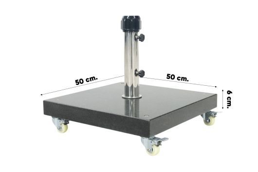 De verrijdbare parasolvoet van 40 kg is een uitstekende en betrouwbare keuze. Deze voet is uitgerust met vier wielen aan de onderkant, waardoor hij gemakkelijk te verplaatsen is. Maak je geen zorgen dat de voet uit zichzelf wegrolt, want de wielen zijn eenvoudig vast te zetten zodat de parasolvoet op zijn plek blijft staan. Gemaakt van graniet en met een gewicht van 40 kg, biedt deze parasolvoet een stabiele basis voor parasols met een maximale diameter van 350 cm. De verstelbare buisdiameter van 38 tot 55 mm maakt het mogelijk om bijna elke stokparasol in deze voet te plaatsen. Een veelzijdige oplossing waar je echt blij van wordt!