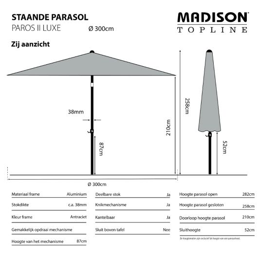 De Madison Paros 2 parasol combineert een stevig ontwerp met handige functies en een stijlvolle afwerking. Ideaal voor in de tuin of op het terras.