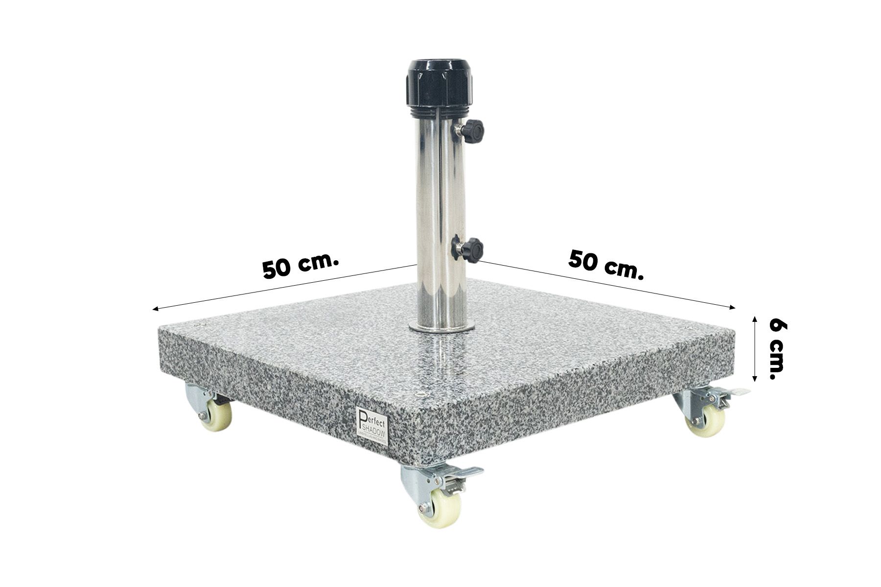 De verrijdbare parasolvoet van 40 kg is een uitstekende en betrouwbare keuze. Deze voet is uitgerust met vier wielen aan de onderkant, waardoor hij gemakkelijk te verplaatsen is. Maak je geen zorgen dat de voet uit zichzelf wegrolt, want de wielen zijn eenvoudig vast te zetten zodat de parasolvoet op zijn plek blijft staan. Gemaakt van graniet en met een gewicht van 40 kg, biedt deze parasolvoet een stabiele basis voor parasols met een maximale diameter van 350 cm. De verstelbare buisdiameter van 38 tot 55 mm maakt het mogelijk om bijna elke stokparasol in deze voet te plaatsen. Een veelzijdige oplossing waar je echt blij van wordt!