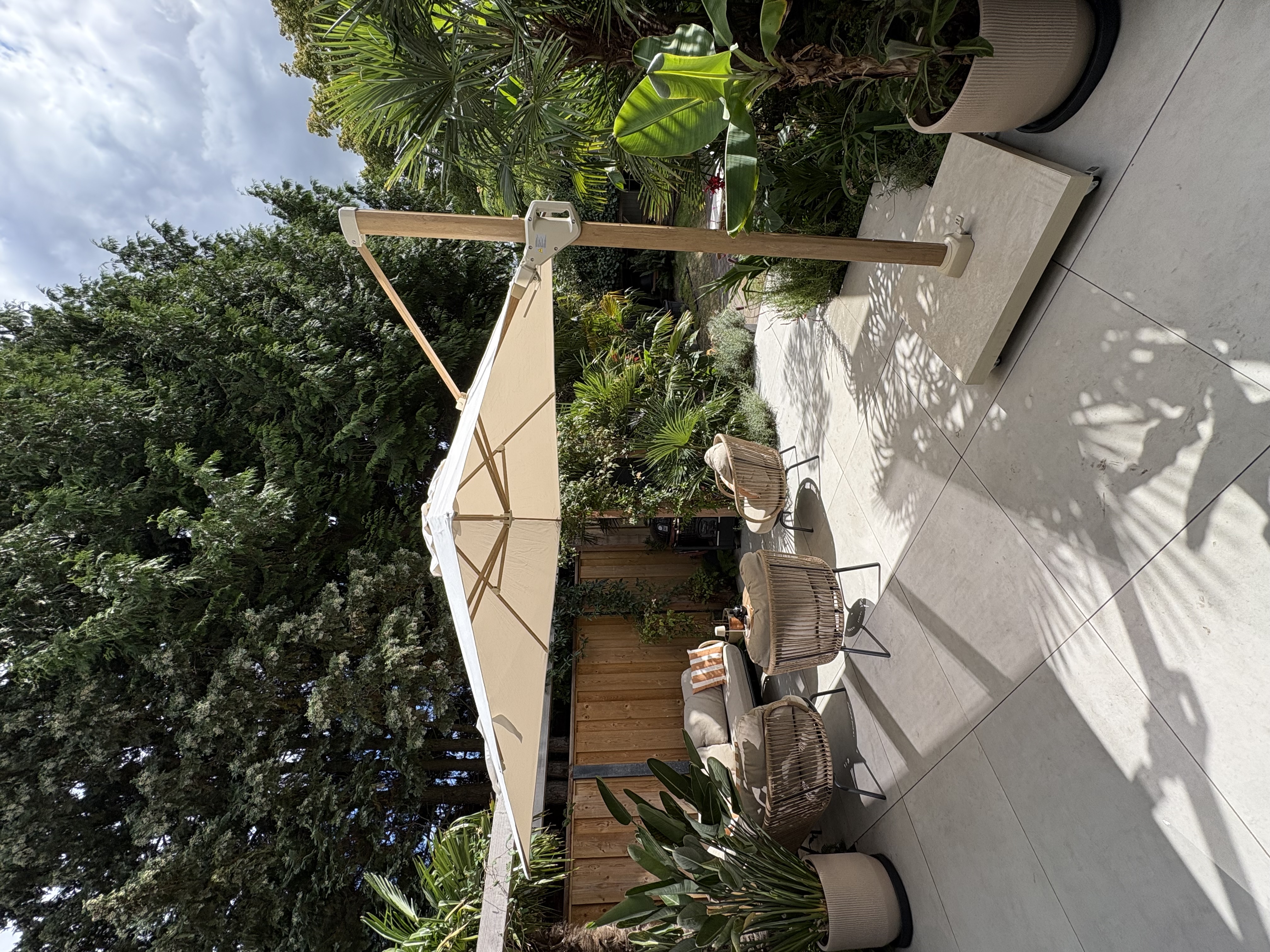Ervaar buitenleven met een schaduwrijke plek door de Platinum Challenger Premium T2 zweefparasol (3x3m). Deze hoogwaardige parasol combineert een elegant aluminium frame met een teaklook en een champagnekleurig doek, wat zorgt voor een verfijnde uitstraling in je tuin. Dankzij de kantelfunctie en 360 graden draaibaarheid geniet je altijd van optimale schaduw. Het stevige UV-bestendige doek beschermt je tegen 98% van de schadelijke stralen en wordt geleverd met een waterdichte en ademende beschermhoes. De verrijdbare, vulbare parasolvoet met luxe keramische afwerking maakt verplaatsen eenvoudig en biedt een stabiele basis. Bestel deze eyecatcher eenvoudig online of bezoek één van onze showrooms in Opheusden, Duiven of Apeldoorn om de parasol in het echt te bekijken!
