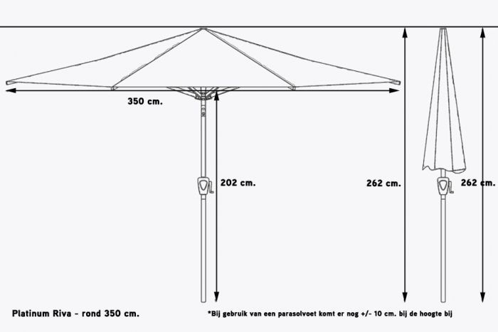Met de Platinum Riva parasol kan je een heerlijke schaduwplek creëren. De Riva parasol is rond en heeft een doorsnede van 3.5 meter. Doormiddel van het handige opdraaimechanisme kan je de parasol eenvoudig in- en uitklappen. De mast van de Riva bestaat uit twee delen. Dit zorgt ervoor dat je de parasol uit elkaar kan halen en gemakkelijk kunt opbergen. Het parasoldoek van de Riva parasol 3.5 meter is licht grijs van kleur. Het doek is van goede kwaliteit, deze is namelijk gemaakt van 100% polyester. Daarnaast is het parasoldoek voorzien van een speciale vuil- en waterafstotende coating. Deze coating zorgt er ook voor dat het doek minder snel van kleur verschiet. Aan het uiteinde van de baleinen van de Riva parasol is een speciale doekspanner gemaakt. Hierdoor staat het doek altijd mooi strak gespannen.