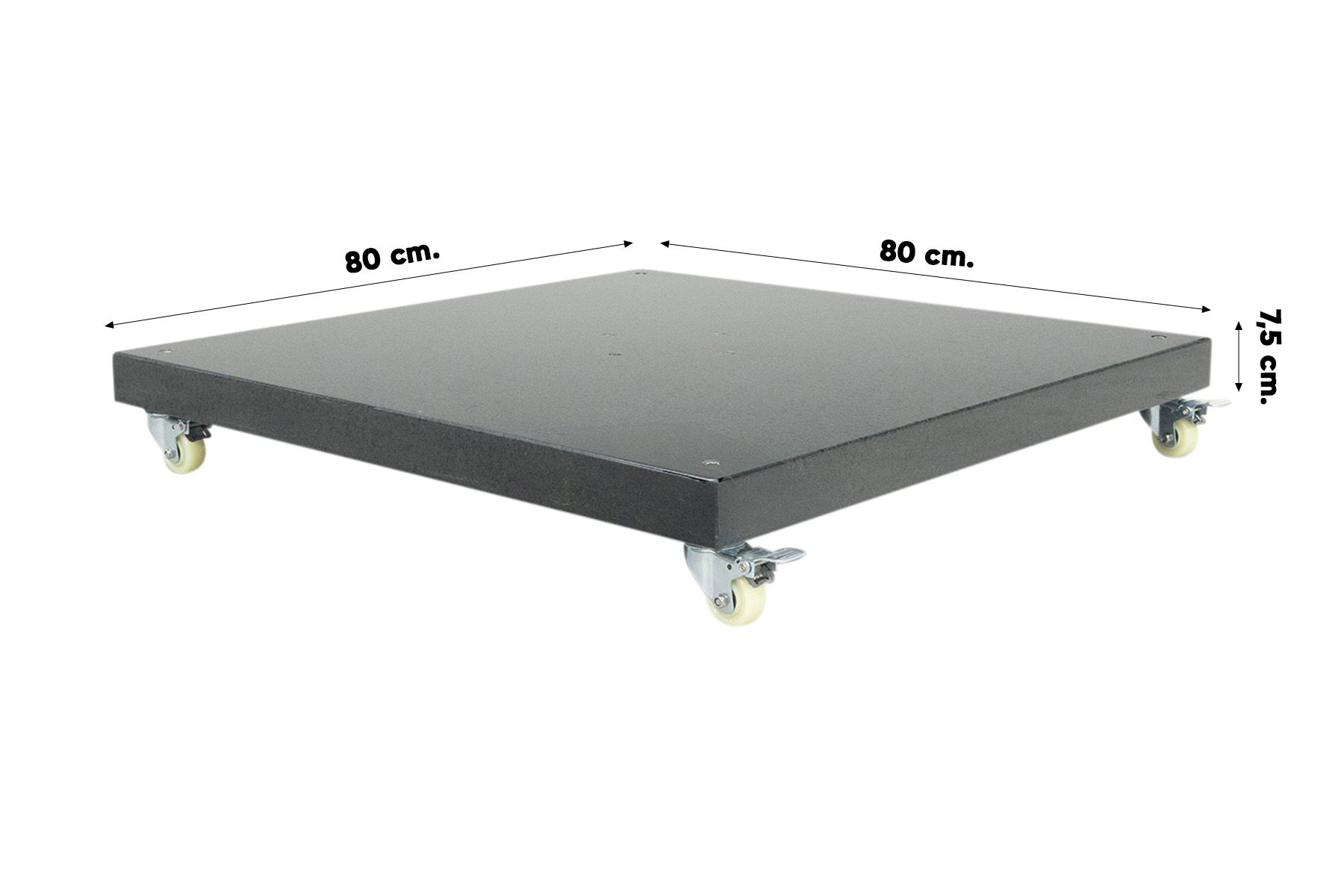 De Marbella parasolvoet is een zware voet van maar liefst 90 kg. De parasolvoet is gemaakt van hardsteen. Doordat de voet gepolijst is, voelt deze glad aan en heeft hij een chique uitstraling. Wil je de parasol verplaatsen? De wieltjes onder de parasolvoet zorgen ervoor dat je de zweefparasol eenvoudig kunt verrijden. Wanneer de parasol op z'n plek staat kun je de wieltjes op slot zetten middels een rem.