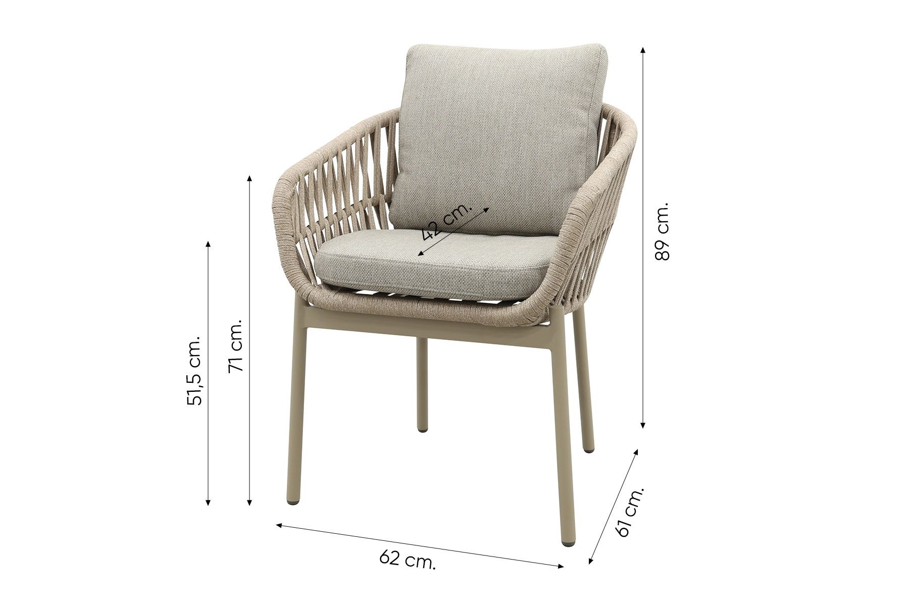De Romeo dining tuinstoelen hebben een stevig aluminium frame in de kleur latte met blended brown rope vlechtwerk in de rug- en armleuningen. Dit rope materiaal is sterk, duurzaam en bestand tegen verschillende weersomstandigheden. De comfortabele kussens zijn gemaakt van een weerbestendige buitenstof. Voor een langere levensduur adviseren we de kussens bij langdurige regen op te bergen. De Ventaro ovale tuintafel van 240x115 cm. heeft een tafelblad van sintered stone (keramiek). Dit materiaal is kras- en slijtvast en kan goed tegen hitte, regen en zon. Het aluminium kruisonderstel is licht, stevig en roestvrij. Dankzij de ovale vorm biedt de tafel ruimte aan 6 tot 8 personen en zit iedereen comfortabel zonder scherpe hoeken.