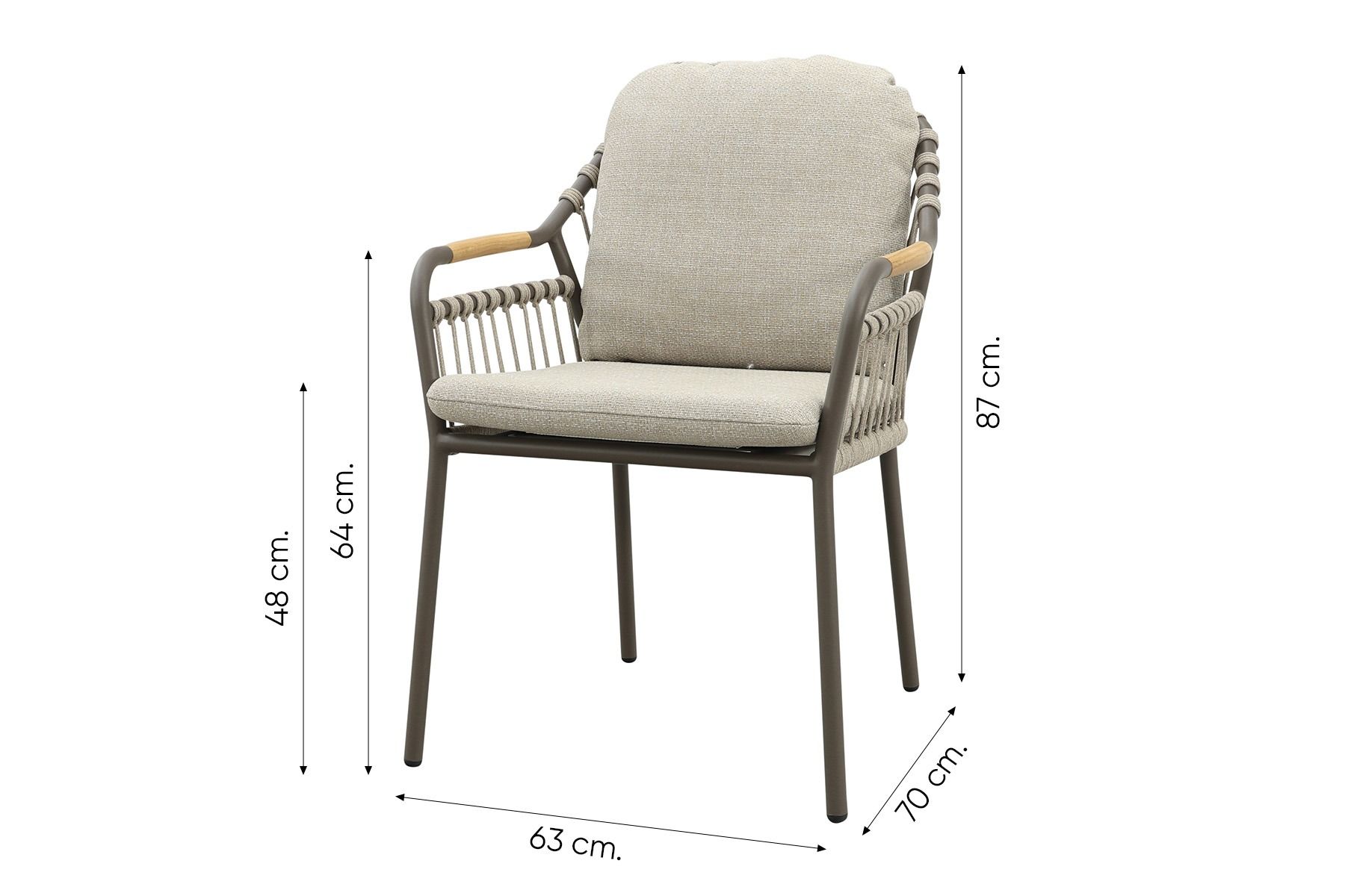 De diningstoel wordt geleverd met comfortabele zit en rugkussens, bekleed met duurzame outdoorstof. Voor een langere levensduur adviseren wij de kussens bij regen of in de winter droog op te bergen of een beschermhoes te gebruiken.