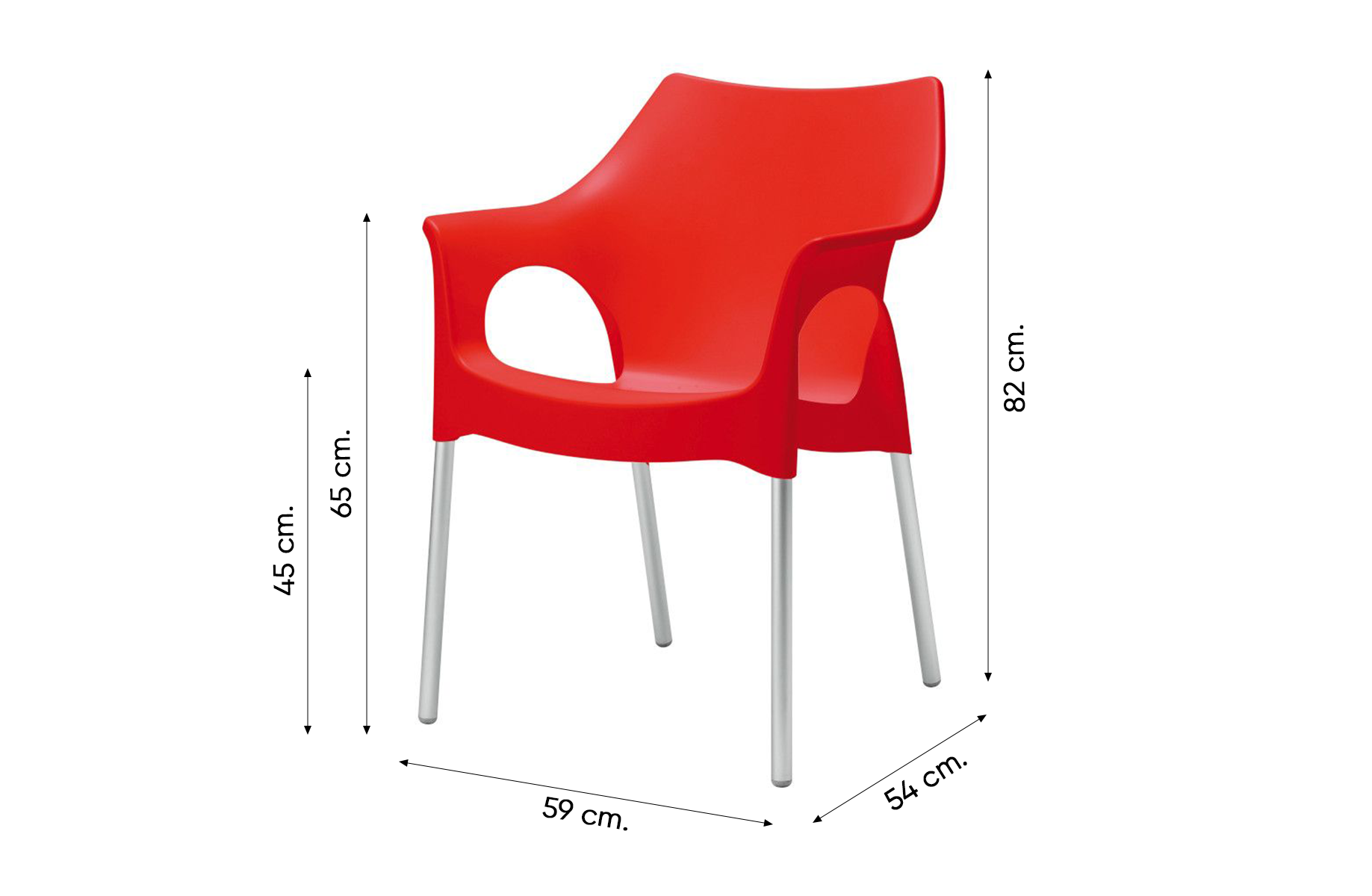 De zitting van de Scab Ola tuinstoel is gemaakt van recyclebaar polypropyleen. Dit sterke kunststof is kleurvast en bestand tegen zonlicht. Je hoeft dus niet bang te zijn dat de stoelen snel verkleuren. De poten van aluminium zijn licht van gewicht, roestvrij en makkelijk schoon te maken. Even afnemen met een doekje en ze zien er weer netjes uit.