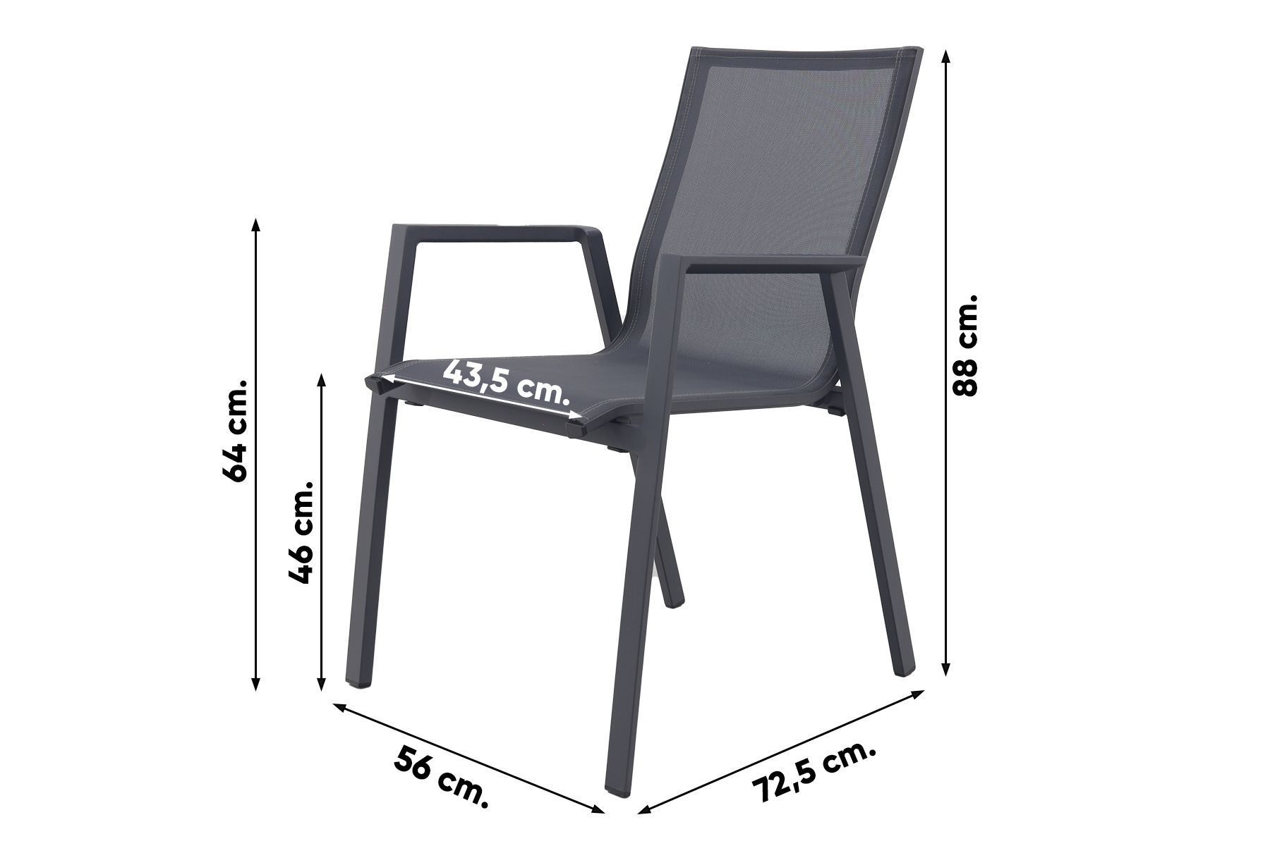 Het frame is gemaakt van aluminium en dus licht in gewicht waardoor de stoel gemakkelijk te verplaatsen is. Voor extra bescherming is het frame afgewerkt met een antracietkleurige poedercoating. De zit en rugleuning van de Atmos stapelstoel zijn gemaakt van textileen. Dit is een geweven nylon draad dat comfortabel aanvoelt. Dus ook zonder kussen heeft de Atmos stapelbare tuinstoel een comfortabele zit