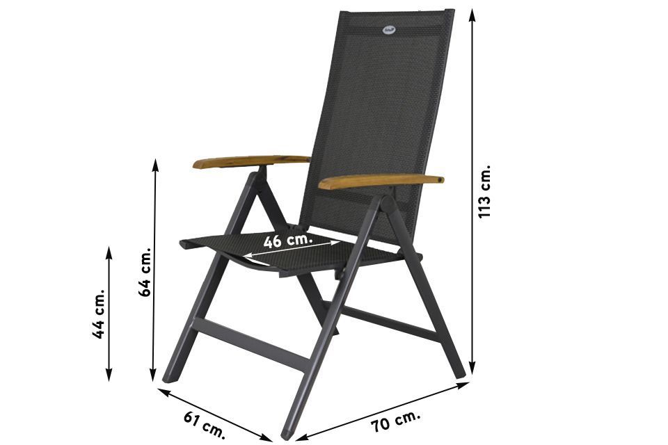 Deze verstelbare tuinstoel heeft een stevig aluminium frame en teak houten armleuning, tussen dit frame is een stevig textileen doek gespannen. Dit doek zorgt ervoor dat de stoel erg lekker zit. De stoel is in meerdere standen te stellen zodat deze perfect geschikt is om in te dineren en na het eten lekker in de relax stand te zetten. Het textileen doek is erg gemakkelijk schoon te maken.