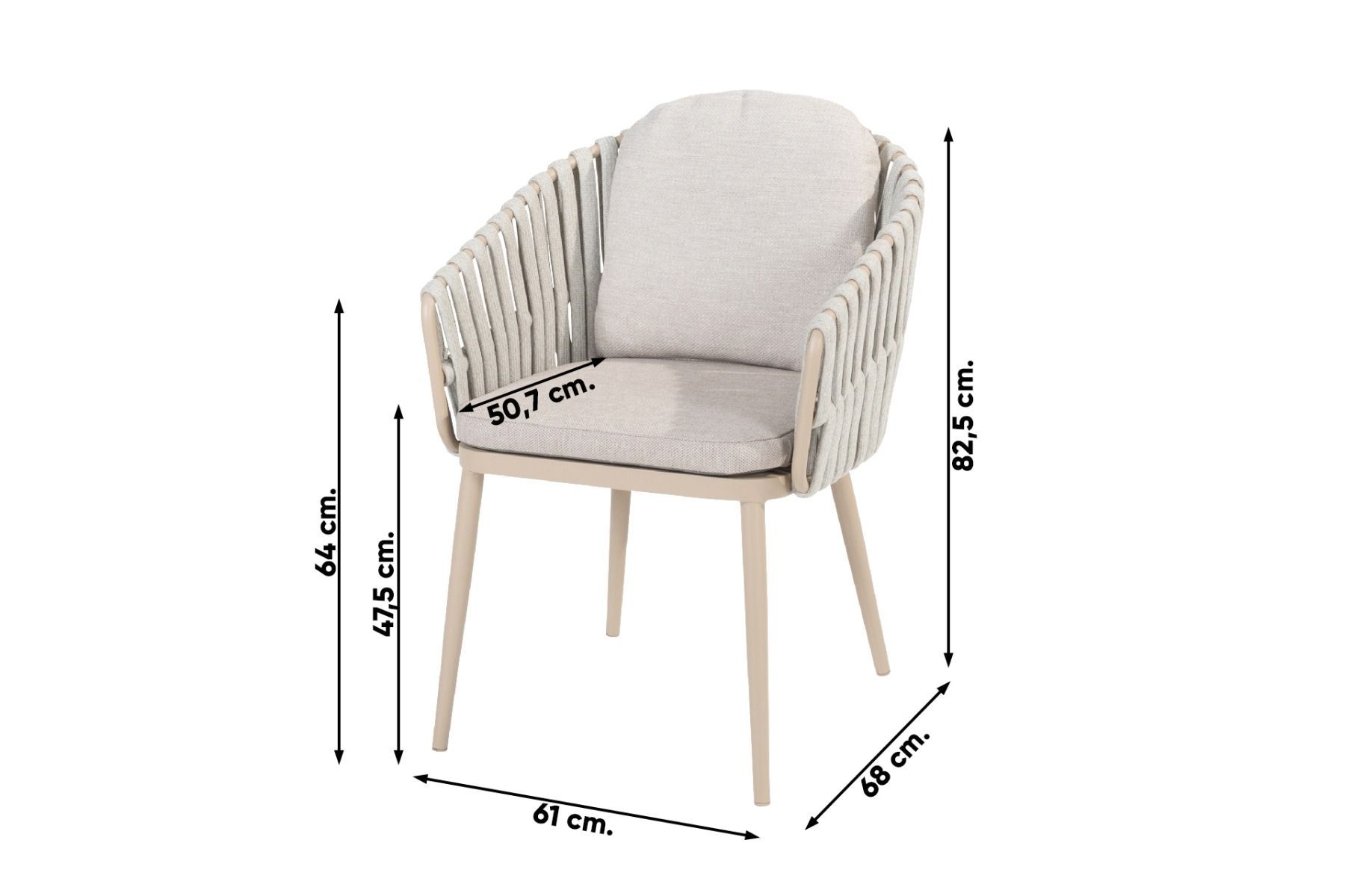 De Eva tuinstoel van Taste heeft een frame van aluminium. Een materiaal dat licht van gewicht is en een lange levensduur heeft. Dit aluminium heeft een poedercoating gekregen in de kleur 'latte'. Een beige kleur die een unieke uitstraling aan deze stoel geeft. Om het aluminium frame zijn brede stroken rope of touw gevlochten. Door deze brede stroken heeft deze stoel echt een unieke uitstraling gekregen. De zit- en rugkussens worden standaard meegeleverd en zijn gemaakt van Olefin. Deze stof is bestand tegen alle weersinvloeden, ze kunnen dus tegen een regenbuitje! Toch raden wij wel aan om de kussens droog op te bergen wanneer deze niet worden gebruikt, zo blijven de kussens het langste mooi.