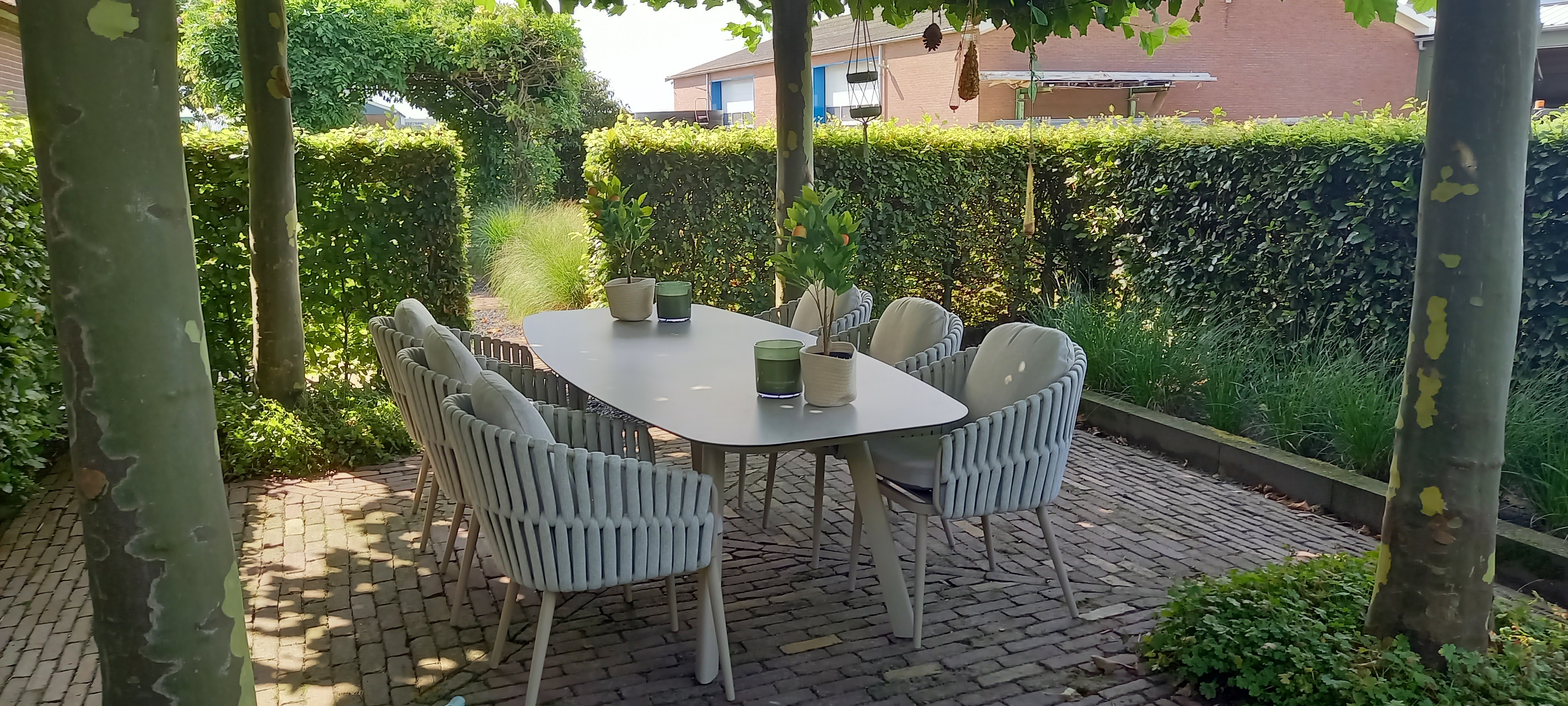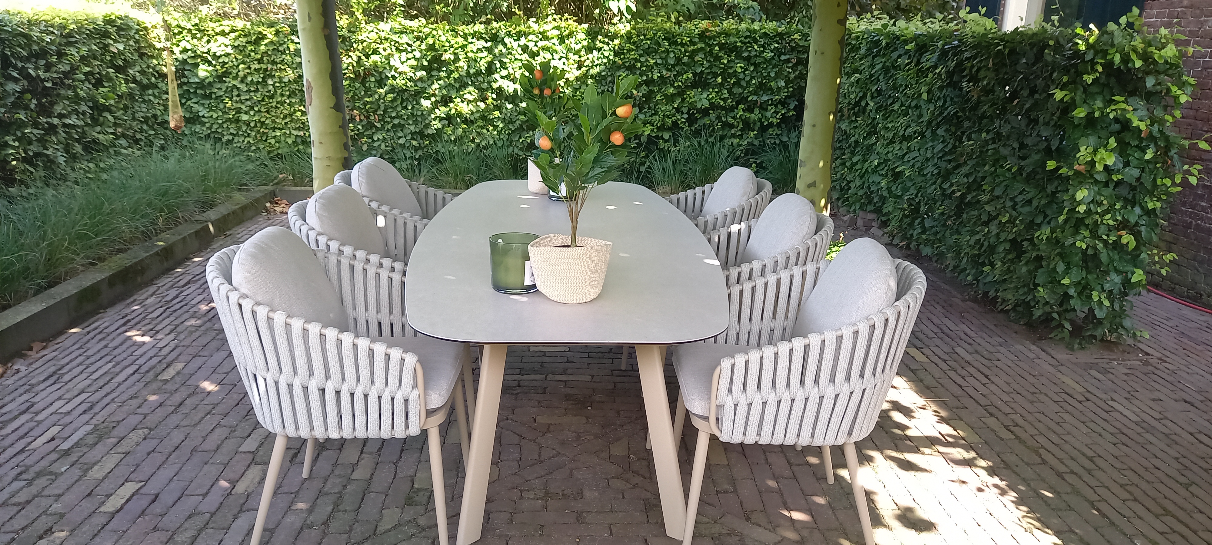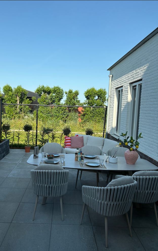 De combinatie van de Eva dining tuinstoel en de Manolo tuintafel vormt een luxe tuinset die zowel stijlvol als functioneel is. Met zijn aluminium frame en unieke rope vlechting biedt de Eva stoel duurzaamheid en een tijdloze uitstraling, terwijl de bijgeleverde Olefin kussens comfort en weerbestendigheid garanderen. Aan de andere kant voegt de strakke aluminium frame en het keramisch blad met betonlook van de Manolo tuintafel een moderne esthetiek toe die minimaal onderhoud vereist. Deze harmonieuze combinatie van hoogwaardige materialen en verfijnd design maakt deze luxe tuinset een onmiskenbare toevoeging aan elke buitenruimte. Ben je ook zo enthousiast geworden over deze prachtige tuinset? Je kunt hem direct online bestellen! Liever eerst even uitproberen? Breng dan een bezoek aan onze showroom in Opheusden, Duiven of Apeldoorn. We kijken ernaar uit om je te verwelkomen!