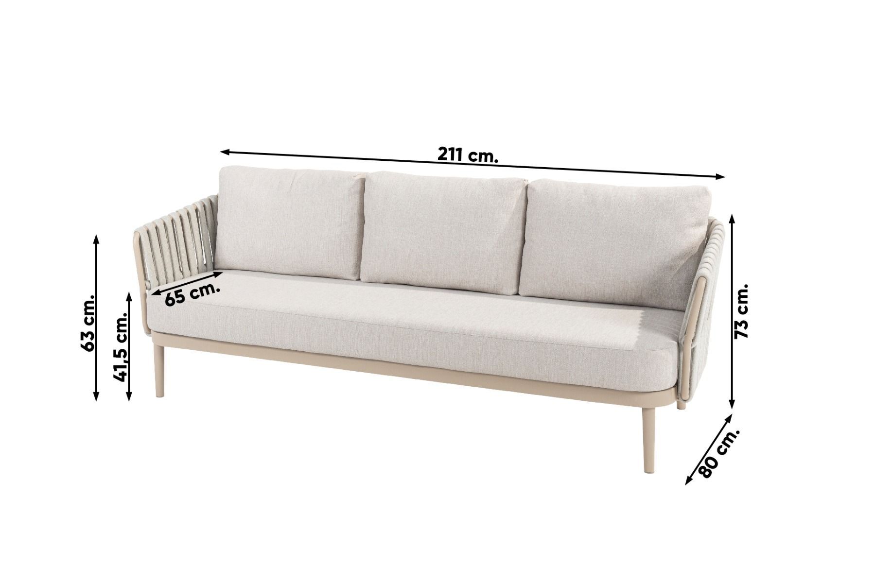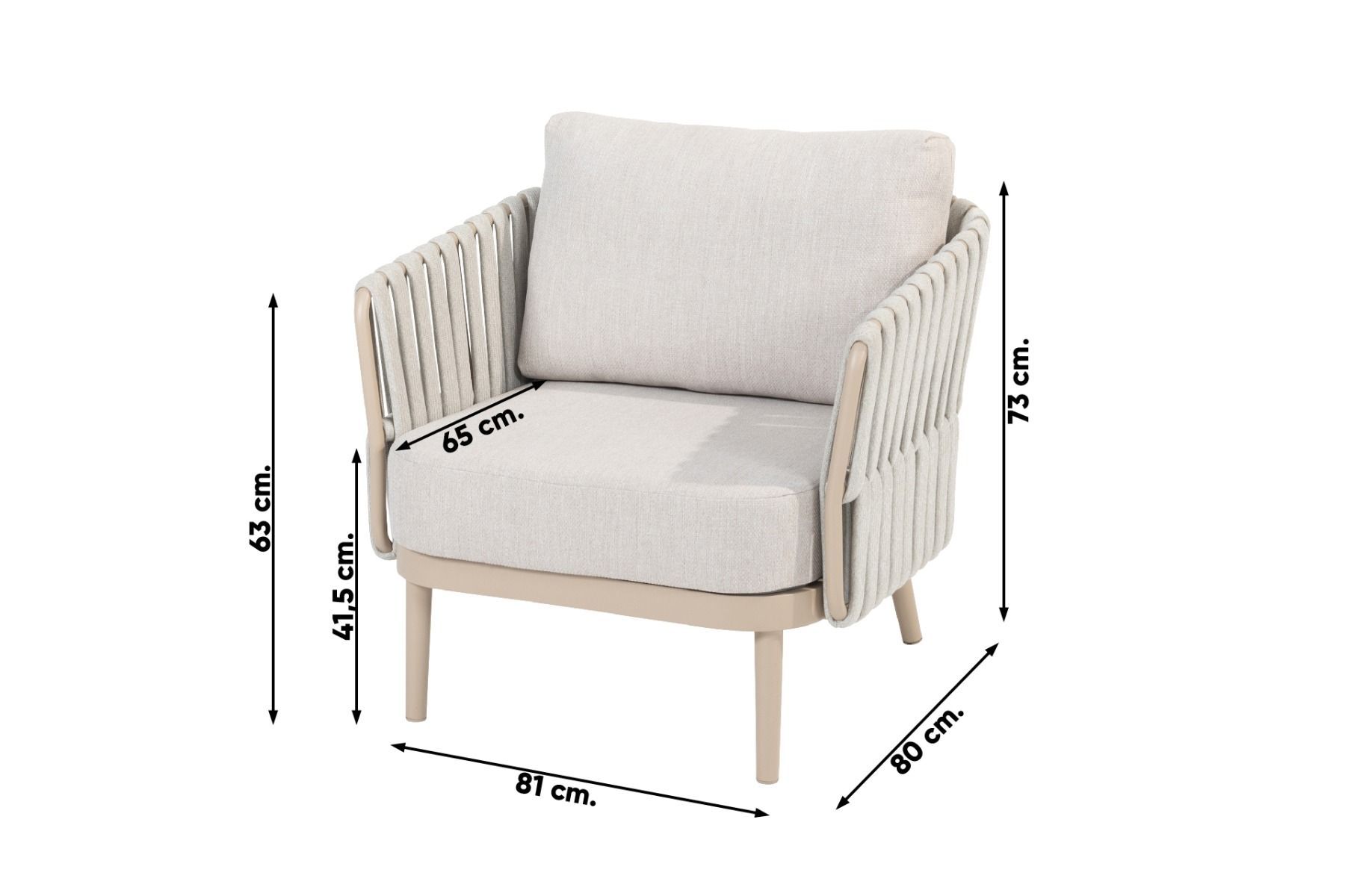 De Eva stoel-bank loungeset van Taste heeft een frame van aluminium. Een materiaal dat licht van gewicht is en een lange levensduur heeft. Dit aluminium heeft een poedercoating gekregen in de kleur 'latte'. Een beige kleur die een unieke uitstraling aan deze loungeset geeft. Om het aluminium frame zijn brede stroken rope of touw gevlochten. Door deze brede stroken heeft deze stoel echt een unieke uitstraling gekregen. De zit- en rugkussens worden standaard meegeleverd en zijn gemaakt van Olefin. Deze stof is bestand tegen alle weersinvloeden, ze kunnen dus tegen een regenbuitje! Toch raden wij wel aan om de kussens droog op te bergen wanneer deze niet worden gebruikt, zo blijven de kussens het langste mooi.