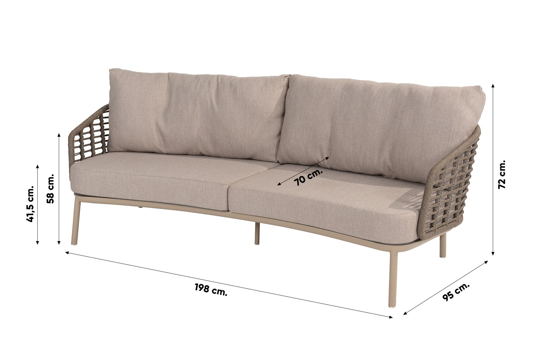 De Taste Puglia loungeset bestaat uit een comfortabele 3-zits loungebank en losse loungestoelen. De tuinmeubelen zijn te herkennen aan de prachtige combinatie van een latte-kleurig aluminium frame en rope. Aluminium is populair door de onderhoudsvriendelijke, weerbestendige en stevige eigenschappen. Om het aluminium frame zit een weerbestendig touw, rope, gebonden. Het rope is op een unieke manier gebonden om het frame. De comfortabele kussens zorgen ervoor dat je urenlang kunt blijven zitten. Zonder kussens kan de loungeset het hele jaar door buiten blijven staan.