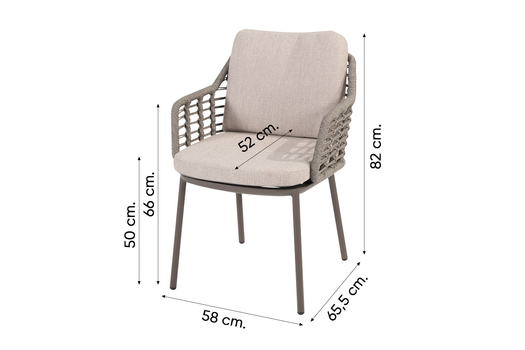 Het tafelblad van de Taste by 4SO Denia is uitgevoerd in een natuursteenlook met een warme uitsraling die perfect aansluit bij de kleur terre. Keramiek op gehard glas geeft de tafel een luxe uitstraling en maakt het blad tegelijkertijd krasbestendig, weerbestendig en eenvoudig te reinigen. Het stevige aluminium onderstel is roestvrij en onderhoudsarm, waardoor de set jarenlang mooi blijft. De Puglia stoelen zijn gemaakt van licht van gewicht aluminium en zijn afgewerkt met hoogwaardig rope in een uniek gevlochten patroon. Dit materiaal is bestand tegen diverse weersinvloeden en eenvoudig in onderhoud. De comfortabele kussens maken lange zomeravonden extra aangenaam.