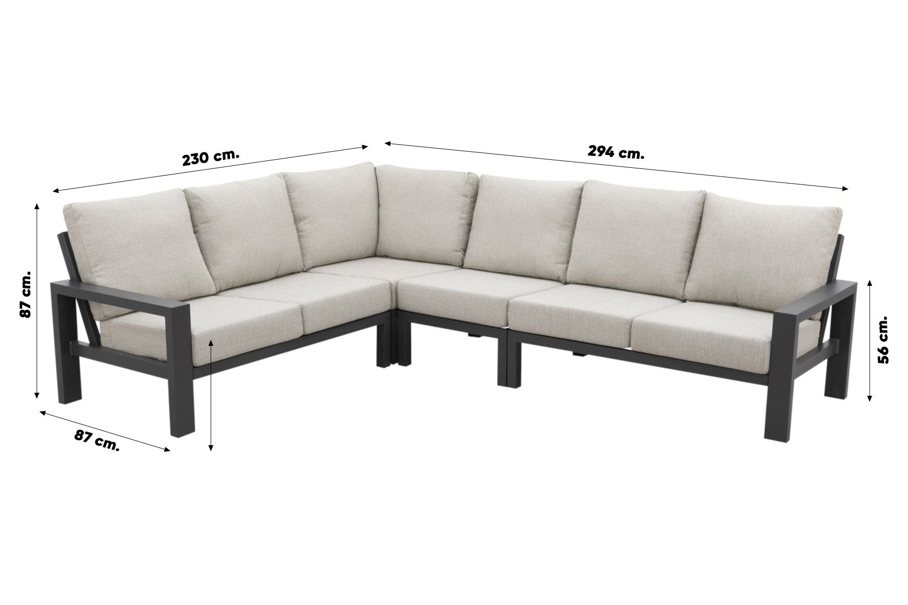 De hoekbank bestaat uit vier delen: twee 2-zitsdelen, een hoek en een middenelement. Door deze modulaire opbouw pas je de opstelling eenvoudig aan jouw tuin aan. De royale zitkussens zijn uitgevoerd in lichtgrijs en bieden optimaal comfort. Dankzij de afritsbare hoezen zijn ze bovendien praktisch in onderhoud. De constructie is van aluminium, een materiaal dat niet roest, licht van gewicht is én perfect bestand is tegen het Nederlandse weer. Ideaal dus voor wie een loungeset zoekt die jarenlang meegaat zonder veel onderhoud