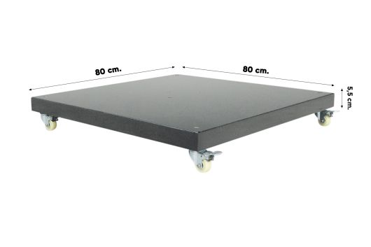 Deze parasolvoet is gemaakt van duurzaam graniet en afgewerkt in een moderne, zwarte kleur. Dat maakt hem niet alleen sterk en slijtvast, maar ook een stijlvolle aanvulling op jouw buitenruimte. Dankzij de stevige constructie is hij perfect geschikt voor grote zweefparasols zoals de Garden Impressions Hawaii en de Platinum parasols, t/m een formaat van 300x300 cm of Ø 350 cm. De hartafstand van 11,2 cm (met een marge van 2 mm) maakt hem compatibel met meerdere parasols. Dankzij de geïntegreerde wielen is de voet makkelijk verrijdbaar, ondanks het gewicht van 90 kg.